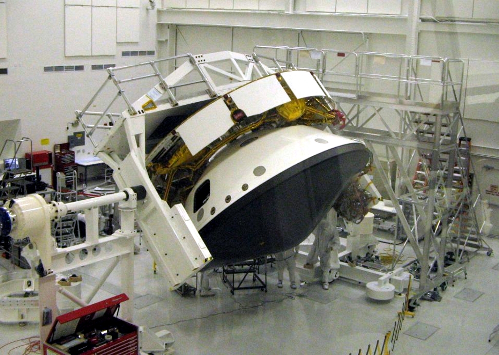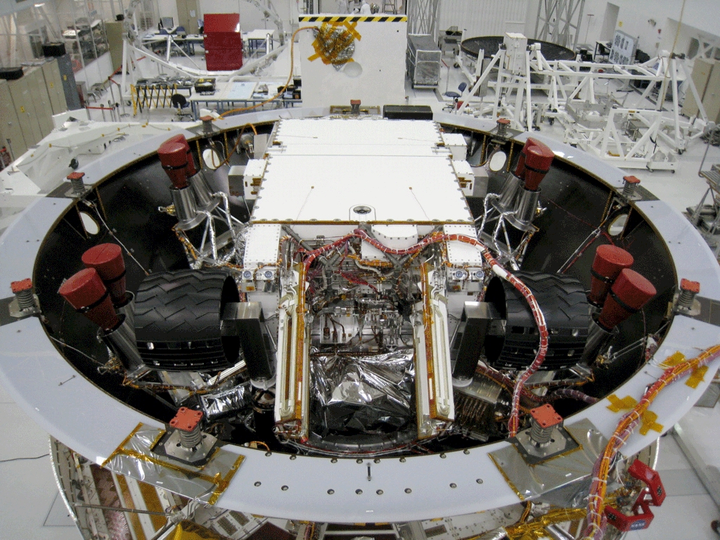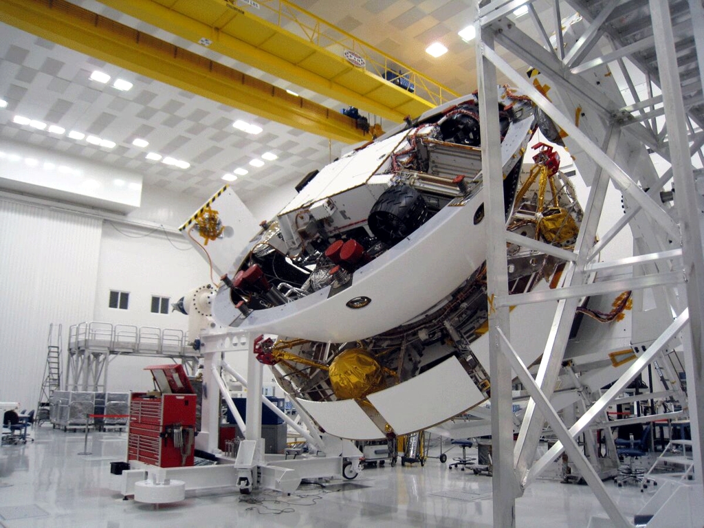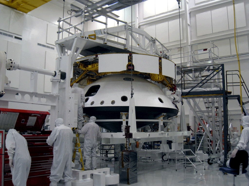 Abb. 1: Backshell von MSL. Die Schutzumhüllung des Raumschiffes, die den Lander und das eigentliche Landeraumschiff, den "Skycrane", während des Fluges und der ersten Atmosphäreneintrittsphase aufnimmt. Die Löcher sind Montageöffnungen für die Last Minute-Installationen kurz vor dem Start. Sie werden erst unmittelbar vor dem Start geschlossen. Abb. 2: Hitzeschild von MSL. Er bildet die untere Umhüllung des Raumschiffes in der Flugphase. Er wird nach Montage der einzelnen Raumschiff-Bestandteile unten an die Backshell montiert. Er ist aerodynamisch geformt und muß die Hitze beim Atmosphäreneintritt aushalten und das Innere vor Temperaturerhöhung schützen. Abb. 3: Das Landeraumschiff, der "Skycrane". Er wird in der Endphase der Landung, durch Bremsraketen in der Schwebe gehalten, den Rover an Seilen auf die Oberfläche herablassen. Siehe auch die Beschreibung der Landephase (Schritte 9 bis 11) auf der vorherigen Seite. Man erkennt die vier Paare von Bremsraketen, sowie die gelb-orange gefärbten Treibstofftanks. Er enthält außerdem die Radarsteuerung für den Abstieg durch die Atmosphäre. Abb. 4: Zusammenschnitt (3 Bilder) der Montage von Lander und Skycrane am 13. November 2008. Man sieht, wie der Skycrane auf den eigentlichen MSL-Lander aufgesetzt wird. Deutlich sichtbar sind die großen, schwarzen Räder des Landers und die vier paarweise angeordneten roten Steuerraketen des Skycrane. Abb. 5: Montage des Landers mit der Cruise Stage im November 2008. Hier die Raumschiffkombination von unten noch ohne Hitzeschild in seiner Backshell zu sehen. Man sieht die Unterseite des Landers mit seinen schwarzen Rädern und die acht durch rote Kappen abgedeckten Abstiegsraketen des Skycranes, der den Lander auf der Marsoberfläche absetzen wird. Abb. 6: Kombination von Lander und Skycrane in seiner ovalen Backshell aufmontiert auf die Cruise Stage, das Transportraumschiff zum Mars. Diese ist die ringförmige Kombination unter der Lander Backshell. Die Aufnahme stammt vom 13. November 2008 aus der Endmontagehalle. Der weiße, kastenförmige Rover von unten sichtbar mit seinen 4 großen, scharzen Rädern liegt noch frei. Einer der mit Goldfolie verkleideten runden Treibstofftanks der Cruise Stage ist ebenfalls sichtbar. Abb. 7: Hier ist die Raumschiffkombination nun umgedreht. Oben die ringförmige Cruise Stage wird MSL durch den Weltraum zum Mars befördern. Die Landung ausführen wird nur die Kombination von Skycrane und Rover, die innerhalb der ovalen Backshell montiert ist. Der schwarze Hitzeschild ist unten an die Backshell ebenfalls schon angebracht. Abb. 8: Ein Bild, welches die riesigen Dimensionen des Gesamtraumschiffes zeigt. In dieser Form wird MSL zum Mars fliegen. Nur das runde Landeraumschiff wird landen, nachdem der schwarze Hitzeschild das Atmosphärenraumschiff abgebremst hat. Die weiße runde Backshell enthält den Skycrane, der den Rover sanft auf der Marsoberfläche absetzen wird.