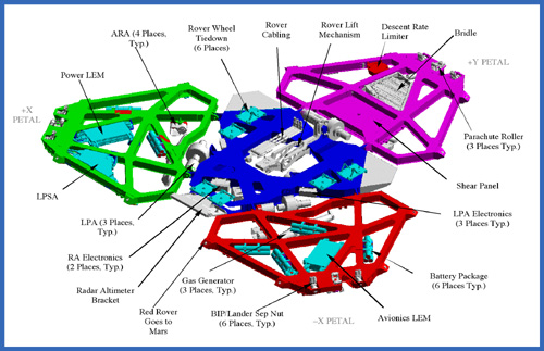 Das Ganze war ein sehr komplexer und missionskritischer Vorgang, da aufgrund der großen Entfernung von der Erde (Ende 2003: etwa 10 Lichtminuten) keinerlei Unterstützung aus dem irdischen Kontrollzentrum kommen konnte. Die ganze Landung war innerhalb von etwa 5 Minuten vorbei und mußte völlig autonom vom bordeigenen Computer einschließlich aller eventuellen Sonderbedingungen abgewickelt werden. Nur bei Pathfinder hatte dies vorher einmal funktioniert. Alle anderen Landeversuche mit dieser Methode waren bis dahin fehlgeschlagen, einschließlich der ESA-Sonde "Mars Express" mit der Landeeinheit "Beagle 2", die Ende Dezember 2003 wahrscheinlich bei der Landung gecrasht war. Das folgende Bild zeigt den schematischen Ablauf (hier kann man die Originalangaben der NASA nachlesen):