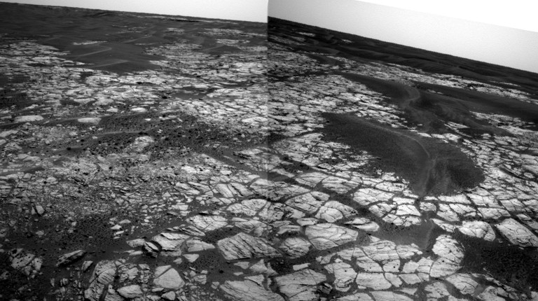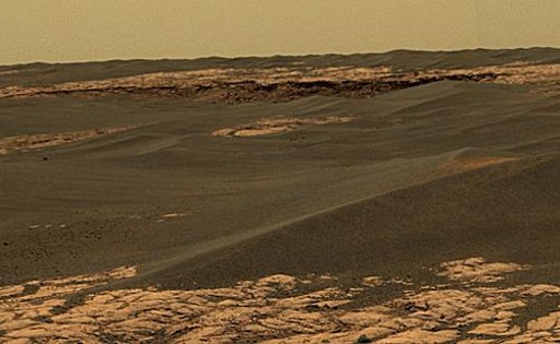 Diese Dünen gilt es, zu überwinden oder zu umfahren, um Erebus durchqueren zu können. Der Rover fuhr sehr vorsichtig nur in kleinen Wegstücken vorwärts, um rechtzeitig reagieren zu können falls eine Sandwelle sich als problematisch erweisen sollte. Der Rover hatte sich durch schweres Gelände zu kämpfen, wie auch das folgende Bild von Anfang Dezember 2005 (~Sol 660) zeigt: