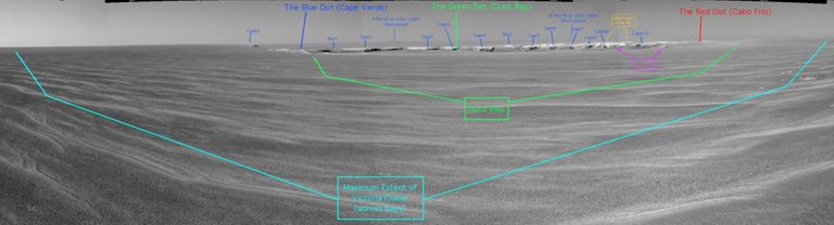 In etwa 800 m Entfernung kann man hier ungefähr 20 Prozent der entfernten Kraterseite sehen. Der Kraterrand ist fragmentiert durch Felsenklippen, die etwa 70 m über dem Kraterboden stehen und sich abwechseln mit weniger felsigen Felsenbuchten. Der Kraterboden ist gefüllt mit Sand, der durch den marsianischen Wind zu Rippeln aufgeworfen worden ist. Die linke Felsenklippe heisst "Cape Verde", die rechte "Cabo Frio". Beide begrenzen den "Duck Bay" genannten Abschnitt des Kraterrandes, vor dem sich der Rover befindet. Der riesige Krater Victoria hat einen Durchmesser von 750 m und eine Tiefe von etwa 85 m. Er ist fünf mal größer als der früher besuchte Krater "Endurance" und vierzig mal größer als der Krater "Eagle", in dem Opportunity zu Anfang des Jahres 2004 gelandet war.
