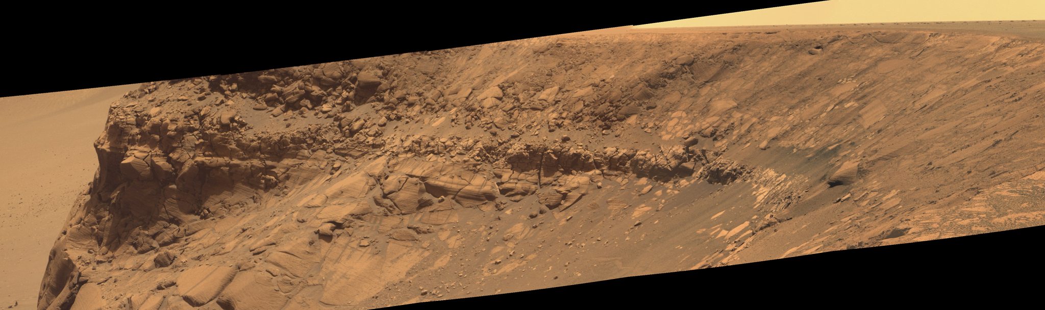 Anfang März 2007 hatte Opportunity den nördlichsten Bereich des Kraters Victoria erreicht und sogar schon überschritten. Das Bild der Abb. 11 zeigt bereits eine Klippe im östlichen Kraterbereich jenseits der Bucht "Golfo San Matias", von der aus sich schwarze Sandflächen in den Krater hineinziehen (Übersicht in Abb. 1 oben auf der Seite). Hier ist also das Material des Kraterrandes unterschiedlich vom Rest des Kraterrandes, das eher heller wirkt.