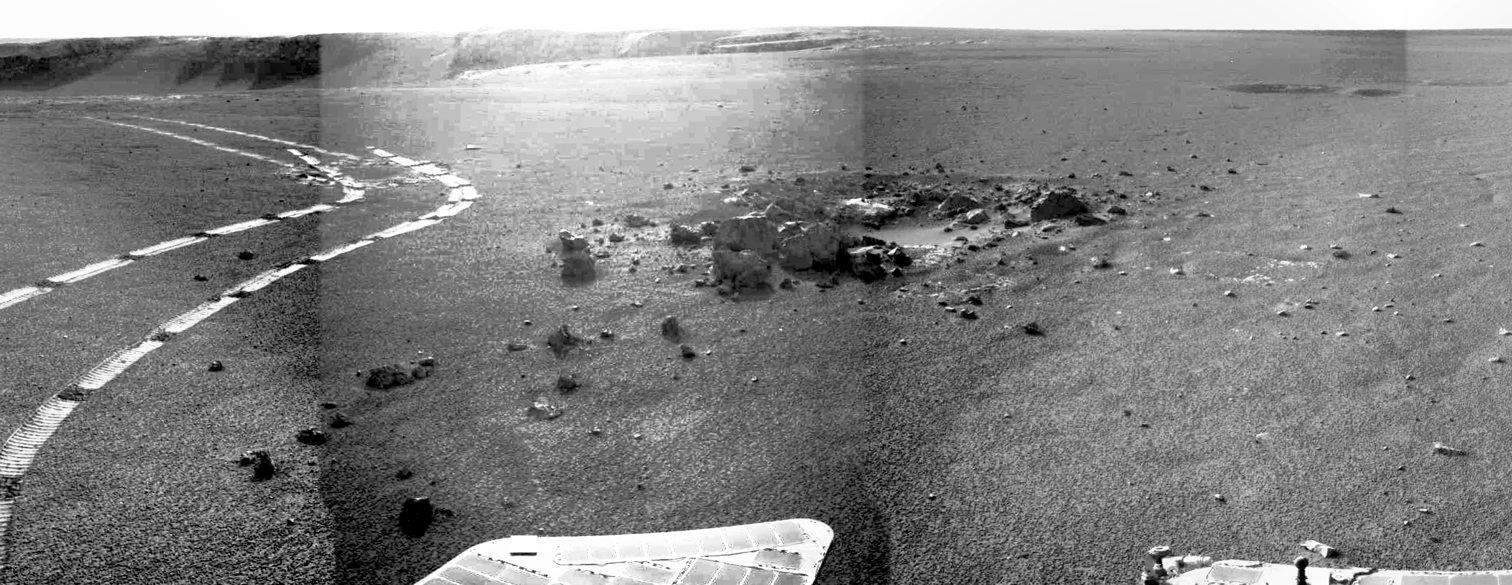 Die Felsen am Sichthorizont der Abb. 3 gehören zu dem "Granada" getauften kleinen Einschlagkrater in Richtung Norden (siehe auch Abb. 1), zu dem sich Opportunity nach dem Kurzaufenthalt an der Klippe "Tierra del Fuego" aufmachte. Der Rover erreichte "Granada" einen Tag später am 28. April 2007 und machte ein Bild von ihm: