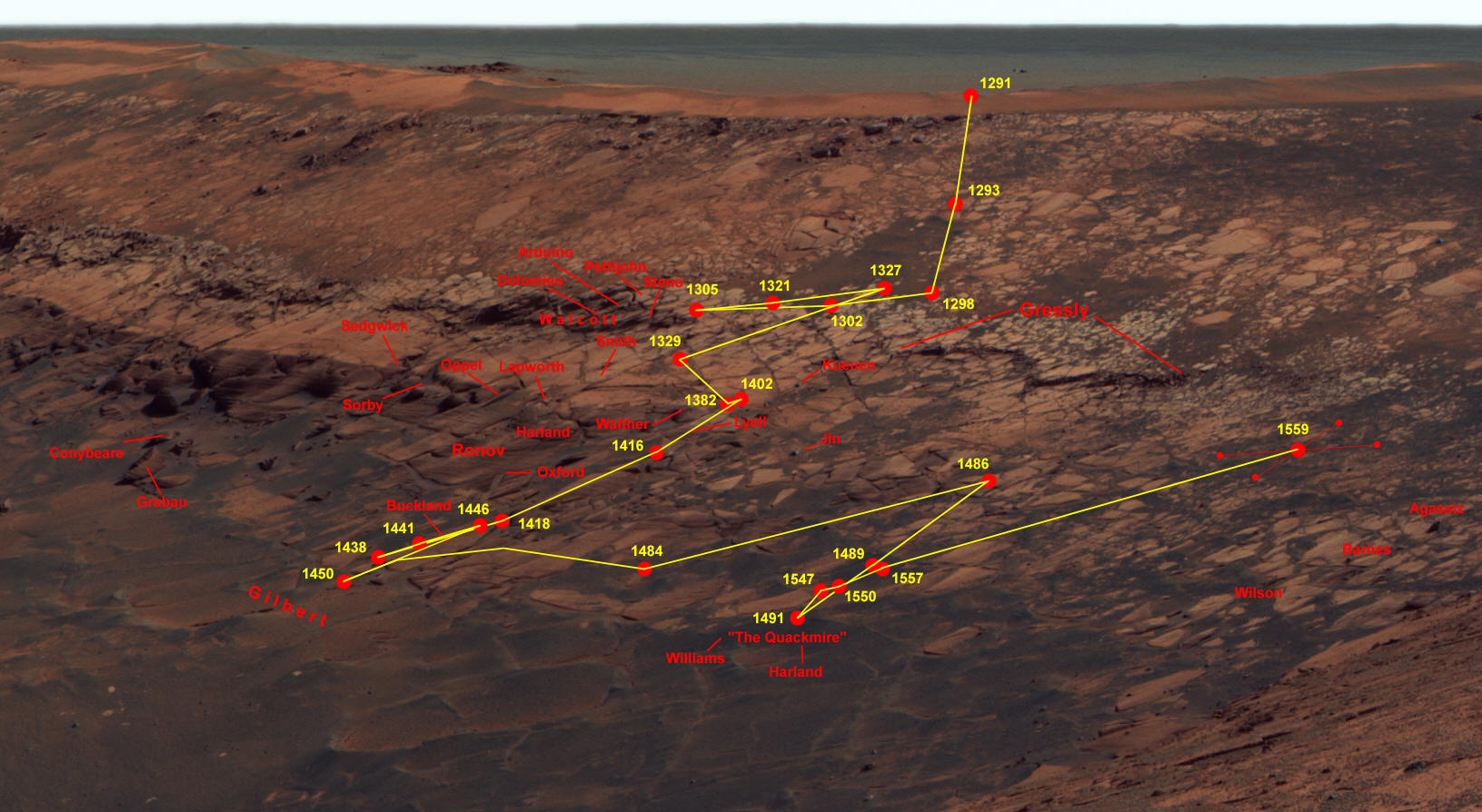 Abb. 2: Wegeplan von Opportunity am Krater Victoria bis Sol 1559 |