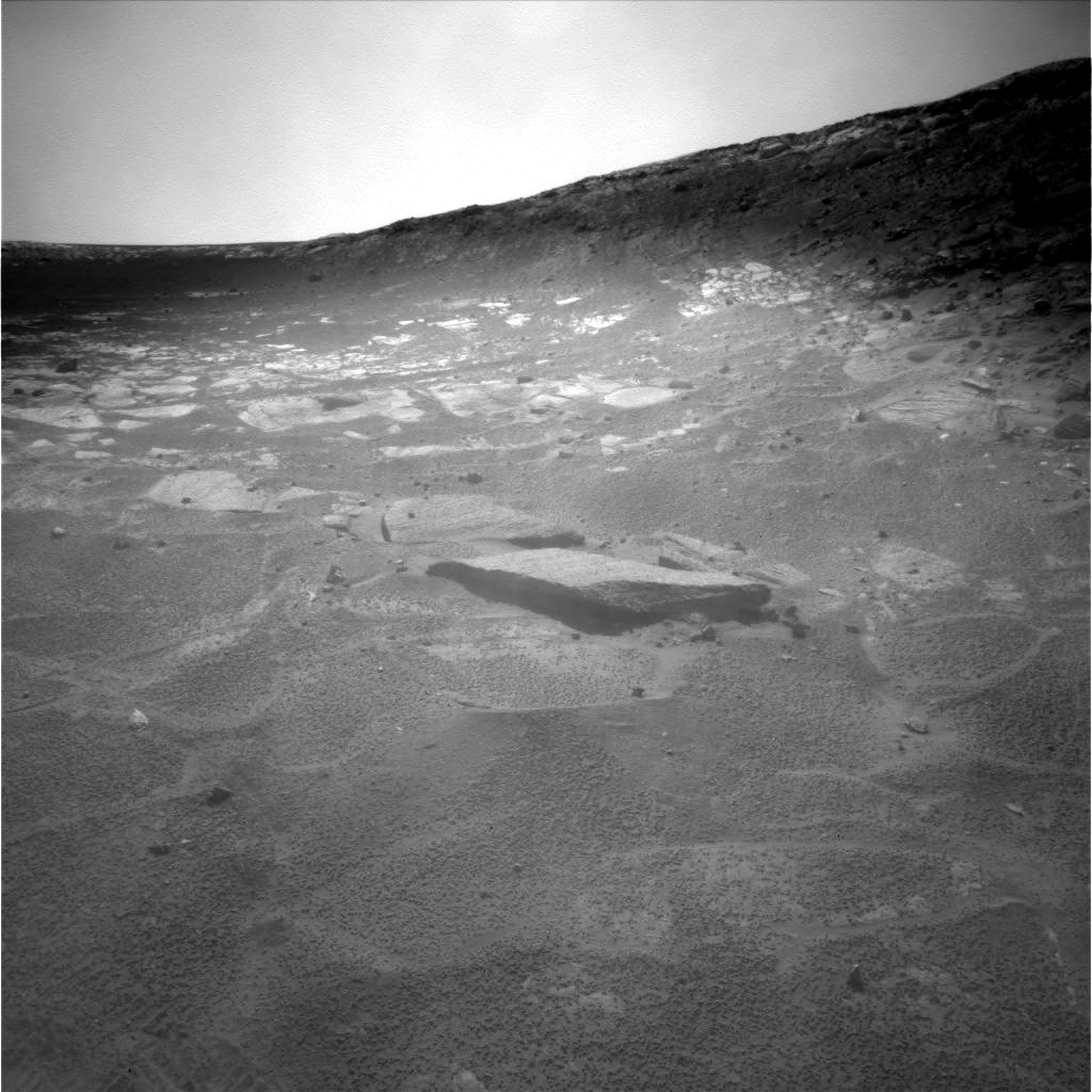 Abb. 6: Blick auf den Kraterrand an Sol 1630 am Einstiegspunkt. Man sieht die Spuren, die Opportunity bei der Einfahrt in den Krater vor fast einem Jahr hinterlassen hat. |