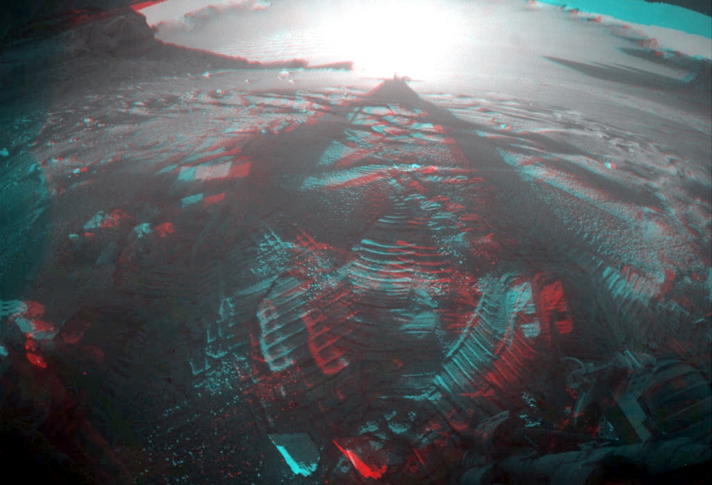 Abb. 7: 3D-Blick zurück von dieser Stelle. Man sieht hier ebenfalls die Spuren von Opportunity bei seiner Fahrt zum Fuß von Cape Verde |