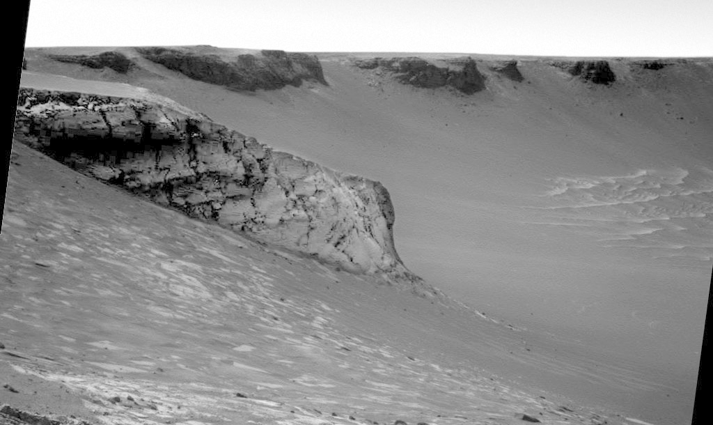 Abb. 4: Blick des Rovers vom Rande von Victoria in Richtung Norden an Sol 1668 nach drei langen Fahretappen Richtung Süden (siehe auch Abb. 1). Am linken Rand geht der Blick auf die Rampe ins Kraterinnere von Victoria vor "Cape Pillar" (siehe das linke Bild der Abb. 1 auf dieser Seite für Details). |