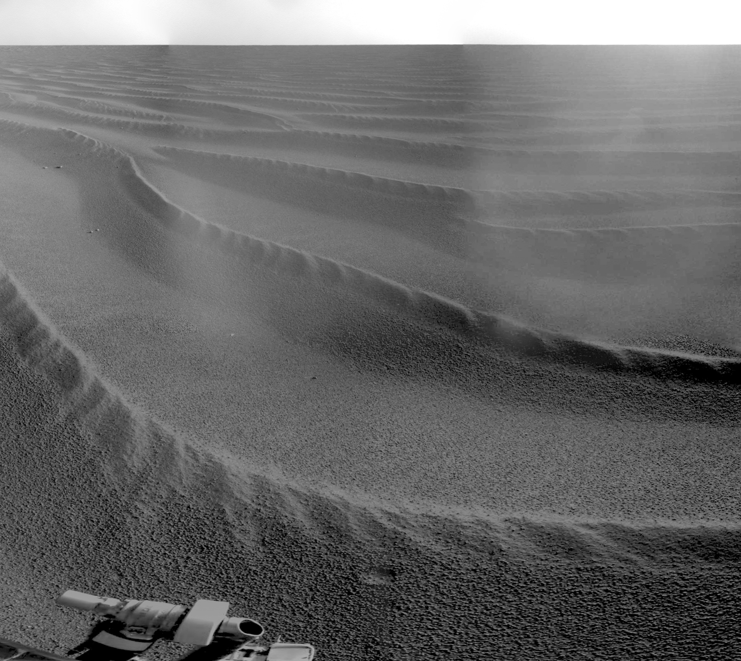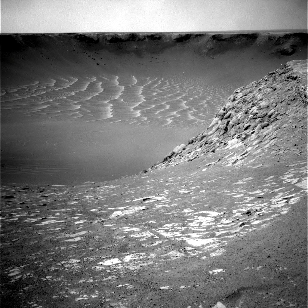 Direkt nach Beginn seiner Reise passierte Opportunity an Sol 1660 den kleinen, direkt am Rande der Duck Bay liegenden Krater "Sputnik", der bei der Ankunft am Krater Victoria im September 2006 auch schon mal "Duck Crater" geheissen hatte, siehe hier. Offenbar kommt die NASA mit ihrer Namensgebung langsam nicht mehr nach :-) :