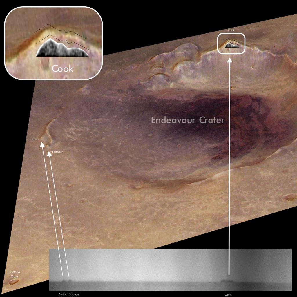 Abb. 5: Von seinem Standort am westlichen Rand von Victoria aus konnte Opportunity Anfang Oktober 2008 schon Teile seines ehrgeizigen Ziels erkennen: Teile der Randberge des Kraters "Endeavour" in etwas mehr als 12 km Entfernung. "Banks" und "Solander" (links) sowie "Cook" (rechts). Nach einem Vorschlag des Benutzers Rui Borges ("ustrax") von UMSF sollte das Ziel nach der Mannschaft des Entdeckerschiffs "Endeavour" unter Kapitän Cook benannt werden. |