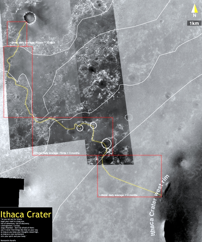 Mit durch Staubteufeln freigeblasenen Solarpaneelen und einer dadurch verfügbaren täglichen Energiemenge von über 600 Wh/Tag machte sich Opportunity ab seinem Sol 1660, dem 25. September 2008, nach dem Verlassen des Kraterinneren von Victoria auf zu seiner auf 2 Jahre ausgelegten langen Reise in Richtung Süden. Ziel war der 12 km (!) entfernte nordwestliche Kraterrand des 22 km durchmessenden Kraters Ithaca (neu getauft: "Endeavour") im Südosten des momentanen Standortes. Wenn man bedenkt, dass die gesamte bisher in fast fünf Jahren zurückgelegte Wegstrecke in der Meridiani-Ebene auf dem Mars nurmehr etwas weniger als 12 km betrug, war dies ein herausforderndes Unternehmen. Der 12 km Wegpunkt wurde nach Sol 1663 überschritten, siehe Abb. 1 links. Das 12 km entfernte Ziel war besonders herausfordernd unter Berücksichtigung des Sachverhaltes, dass der Rover ja nur deshalb das Kraterinnere von Victoria verlassen hatte, weil es bedeutende Indizien dafür gab, dass eines der Räder kurz vor dem Verlust seiner Drehfähigkeit stand.