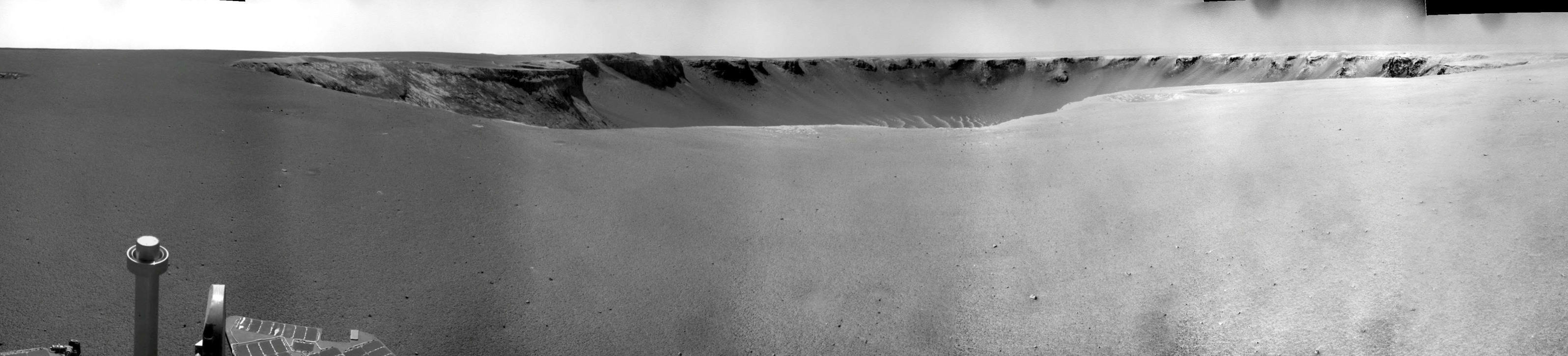 Abb. 2: Opportunity passierte direkt nach Beginn seiner Reise zum Krater Endeavour an Sol 1660 den kleinen Krater Sputnik, der in der Meridiani-Ebene direkt neben den Einstiegspunkt in den Krater Victoria, der Duck Bay, liegt. |