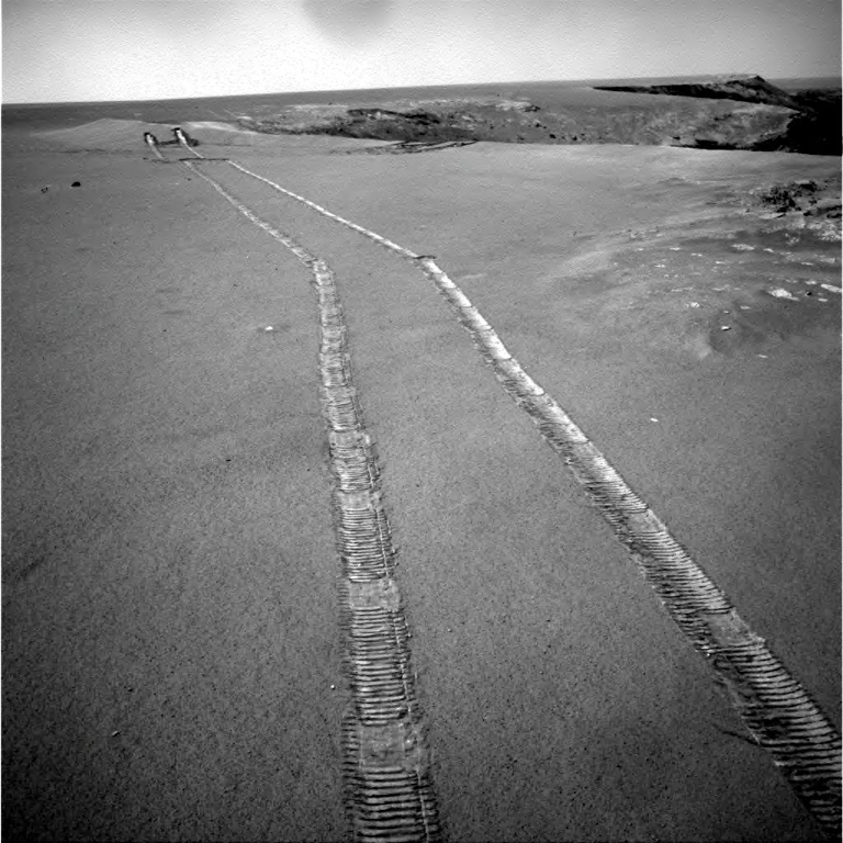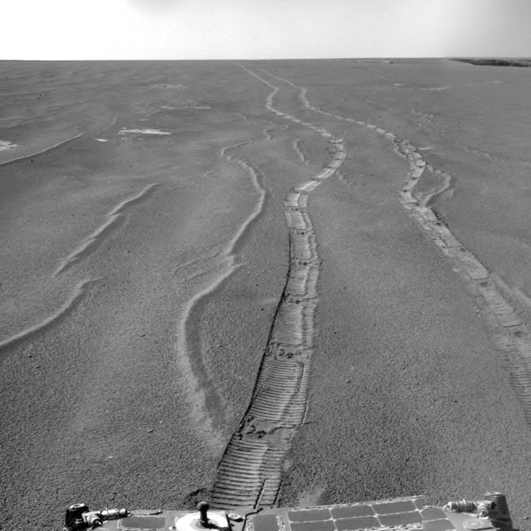 Abb. 3: Blick zurück an Sol 1661 vom Rand des Kraters Sputnik (links) und an Sol 1663 nach einer weiteren Tagesetappe von 153m (rechts). Durch autonome Steuerung bewegte sich der Rover selbständig über die flache Meridiani-Ebene und umfuhr die kleineren und größeren Sanddünen in eleganten Kurven. |