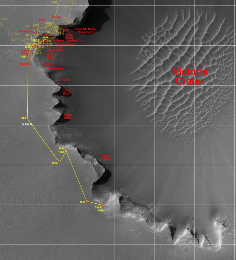 Bis Mitte Oktober 2008 hatte Opportunity schon ein großes Stück entlang der Kraterkante von Victoria zurückgelegt. An Sol 1676, dem 9. Oktober 2008 sah die zurückgelegte Wegstrecke wie folgt aus: