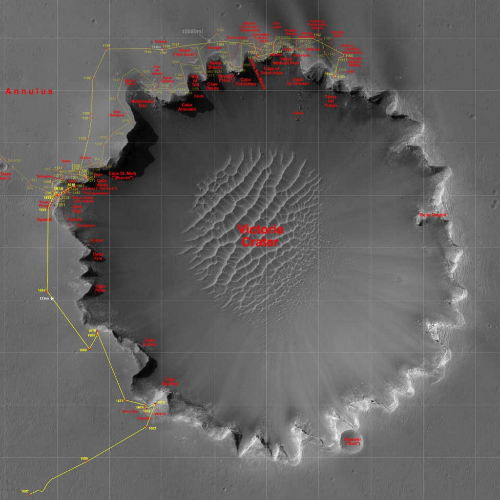 Die obigen Roverpositionen gestatteten es zum letzten Mal, eindrucksvolle Fotos vom Inneren des Kraters Victoria aufzunehmen. Ab jetzt ging es für Wochen, Monate und vielleicht sogar Jahre hinweg wieder über die von einem zum anderen Horizont reichenden Ebenen des Meridiani, über Sandwüsten, Sandrippeln und dem einen oder anderen kleineren oder größeren Krater. Die Verantwortlichen bei der NASA und auch die Hobbyastromomen im Internet bei USMF hatten sich im Vorfeld eine Menge Gedanken über die möglichst sicherste Strecke zum Krater Endeavour gemacht, die Vorkommnisse in der Vergangenheit verhindern sollten, wie beispielsweise Ende April 2005 das Festsitzen in der "Purgatory-Düne". Es gab mehrere vielversprechende Kurse und die Roverfahrer schienen sich für einen Kurs entschieden zu haben, der zunächst in Richtung Südwesten von Victoria wegführte, um dann in der Folge allmählich nach Süden und dann nach Südosten zu schwenken. Das folgende Bild zeigt einen solchen möglichen Kurs, der die auf dem Weg liegenden Gefahren soweit als möglich minimaliserte. Er war schon im Februar 2008 vorgeschlagen worden vom User ustrax bei USMF: