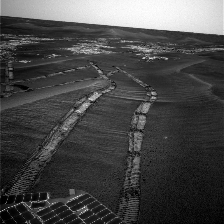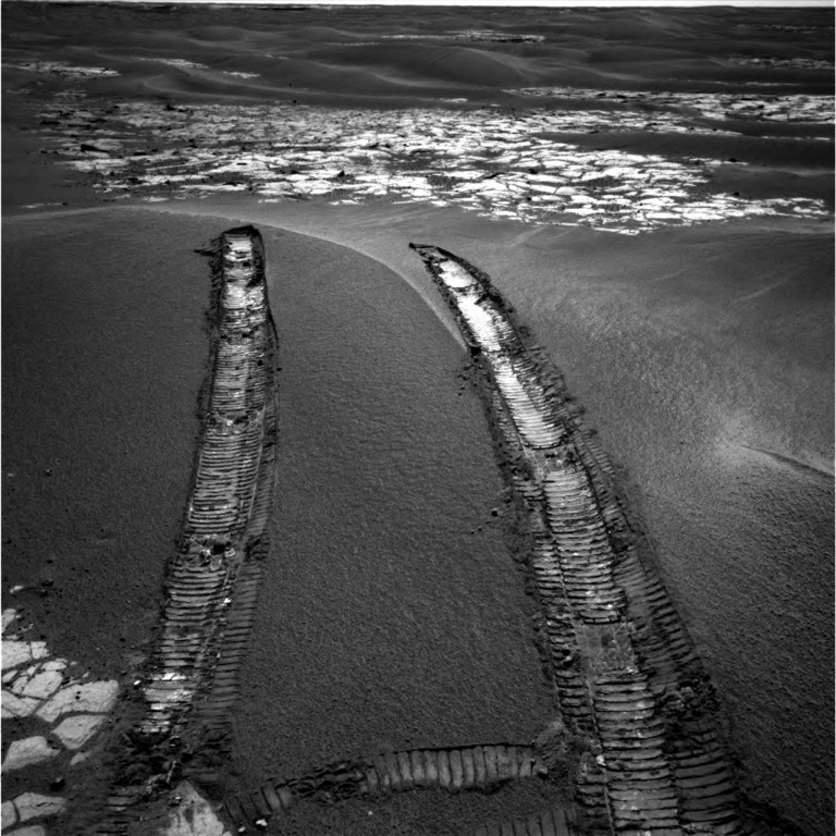 Der Rover fuhr dabei im Zickzack um die zahlreichen, teilweise recht hohen Dünen herum, um ein erneutes Steckenbleiben zu vermeiden. Dadurch wurde der weitere Vorstoss nach Süden insgesamt eine recht langwierige Angelegenheit. Der Erebus-Kraterrand ist von hohen Sanddünen umgeben, die auf dem rechten Bild deutlich im linken Bereich zu sehen sind. Dahinter lag das lang angestrebte Ziel.