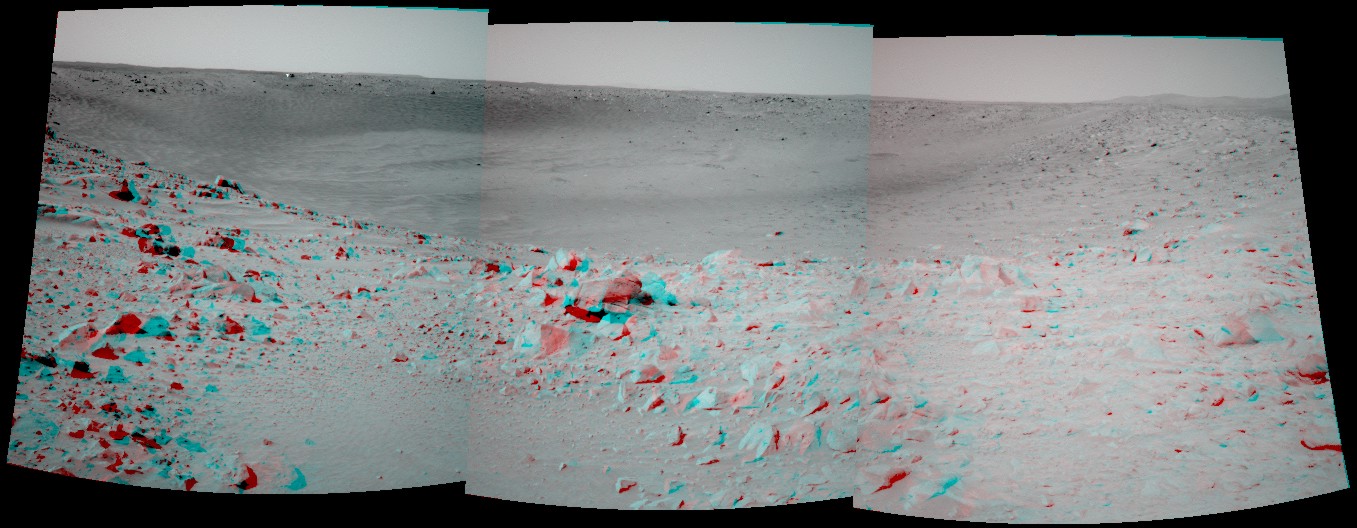 Bonneville ist der größere Krater mit etwa 200 m Durchmesser nordöstlich des urprünglichen Landeplatzes von Spirit. Ein Klick auf das Bild liefert eine 785 kByte große Version des Bildes beim JPL. Ein 26.4 MByte (!!) großes Bild mit phantastischen 13062 x 3538 Pixeln, die wirklich jedes Detail enthüllen, ist ebenfalls hier beim JPL verfügbar. Die NASA Originalveröffentlichung dazu ist hier.