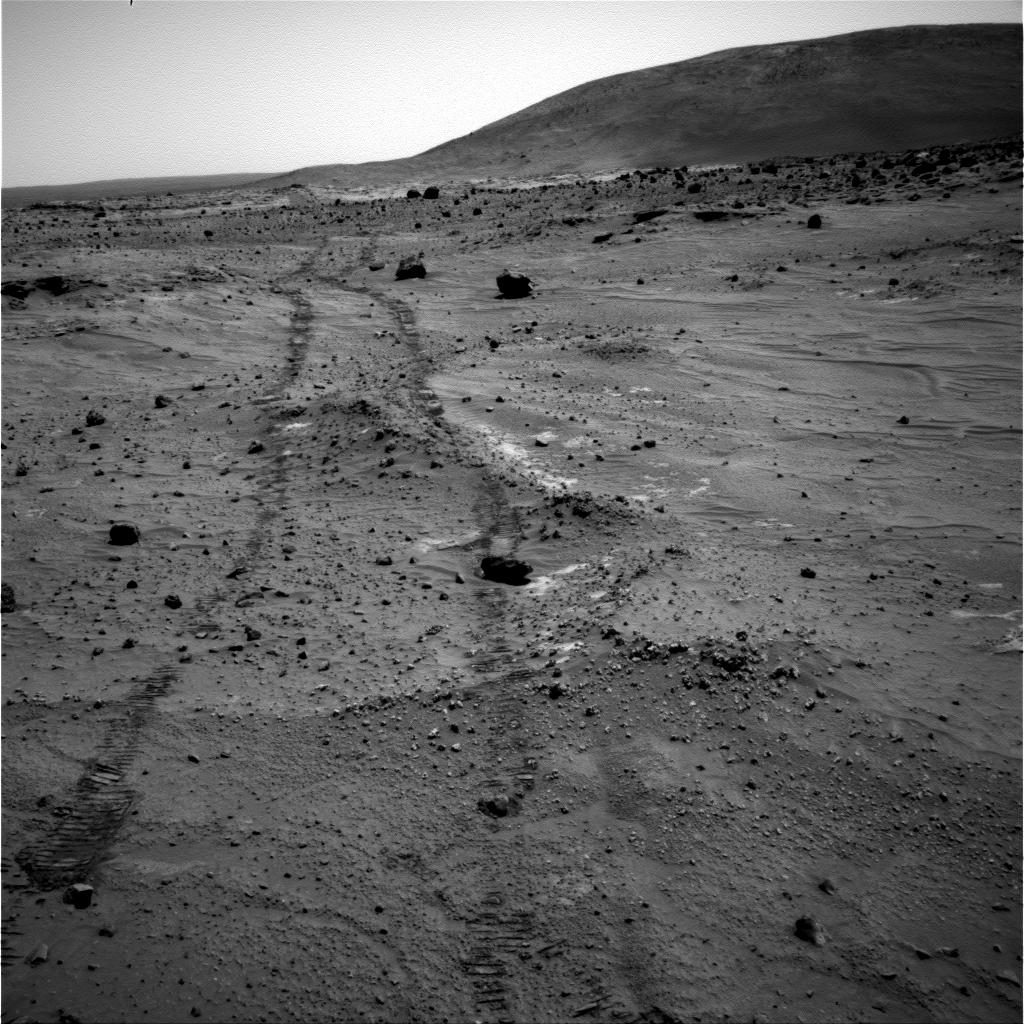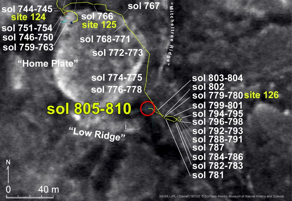 Am 10. April (Sol 804) hatte der Rover die Wende geschafft und sich ein Stück aus dem gefährdeten Bereich herausbewegt. Zu diesem Zeitpunkt hatte er die Home Plate fast wieder erreicht. Abbildung 8 zeigt mit Blick nach Südosten die Problemzone. Im Hintergrund der Wendebereich mit den hellen Sulfatsalzen, in denen sich der Rover ein bisschen festgefahren hatte. Sie liegen verdeckt in einem kleinen, mit Sand aufgefüllten Krater, in den der Rover ursprünglich von links kommend hineingefahren war.
