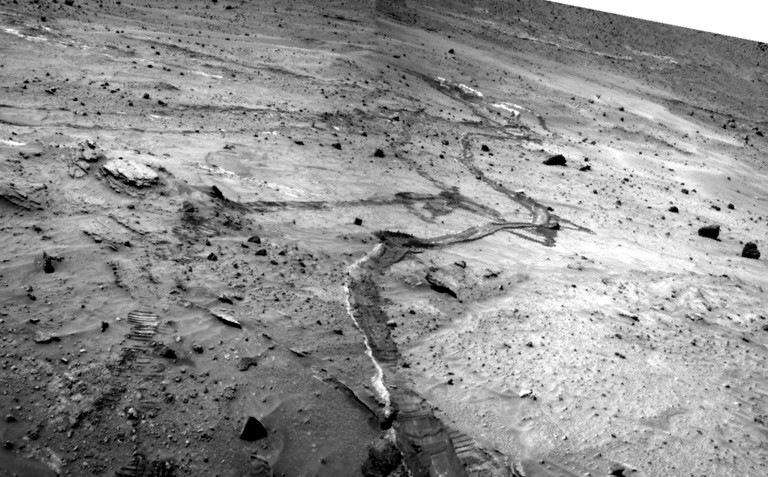 Abb. 12: Blick nach Südosten auf die in den Marsboden gezeichneten Spuren vor der Wende des Rovers |