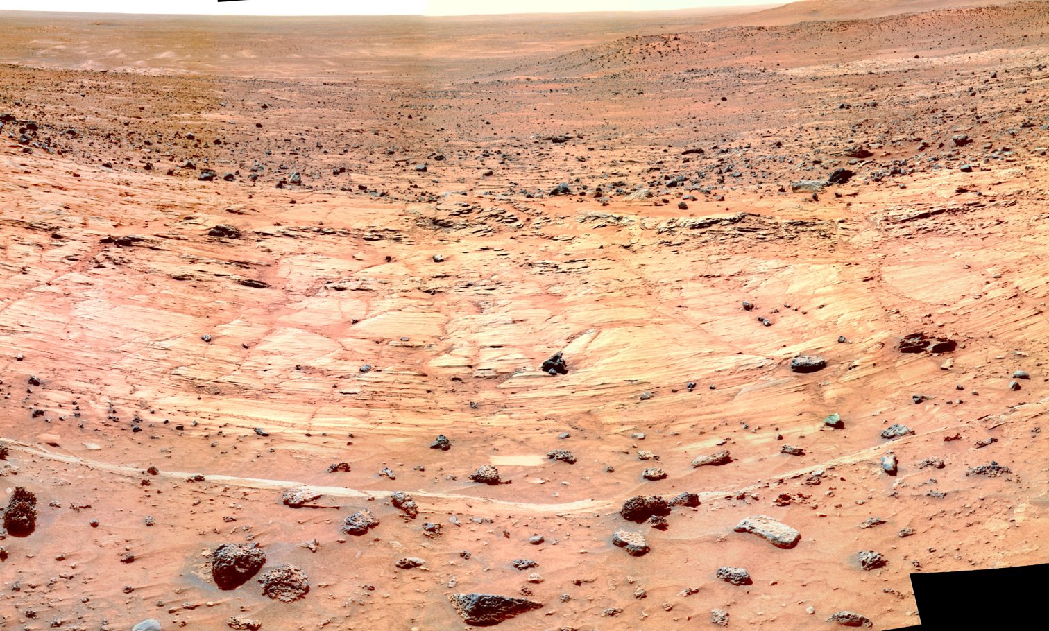 Abb. 3: Blick nach Westen über die Home Plate hinweg in die Gusev-Ebene. Irgendwo hinter den Hügeln rechts war Spirit im Januar 2004 gelandet. |