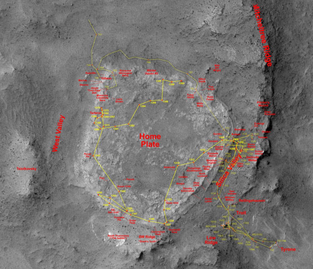 Am 22. Dezember 2007, an Sol 1405, erreichte Spirit die Kante der Home Plate, die er an Sol 768 vor zwei Erdjahren (oder einem Marsjahr) bereits schon einmal passiert hatte. Die Energiesituation des Rovers war zu diesem Zeitpunkt sehr kritisch. Die tägliche Energieaufnahme war wegen des Staubs auf den Solarpaneelen auf etwa 250 Wh/Tag gesunken. Dies befand in der Nähe der Minimalversorgung und erlaubte es gerade so, die Grundfunktionen des Rovers beizubehalten. Das nächste Übersichtsbild zeigt die Wegstrecke des Rovers bis zu diesem Zeitpunkt: