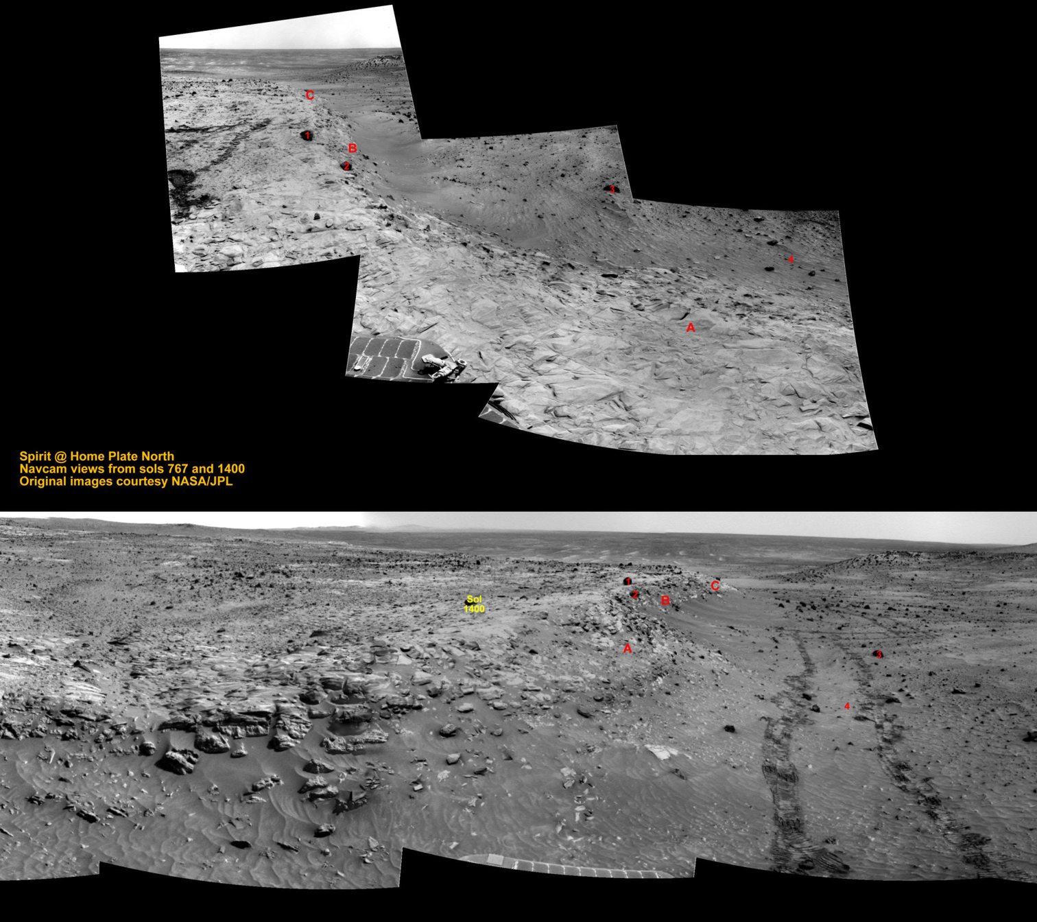 Spirit gelangte mit Erreichen der Nordkante der Home Plate in ein Gebiet, das der Rover bereits vor mehr als 630 Tagen bei seinem ersten Vorstoß zur Home Plate erkundet hatte. Das nächste Bild zeigt einen Vergleich dieses Gebietes aufgenommen mit einer Zeitdifferenz von 630 Tagen. Die roten Punkte und Kreise bezeichnen einige identische Geländemerkmale in beiden Bildern. Das untere Bild zeigt die Situation an Sol 767 bei der ersten Vorbeifahrt an der Home Plate, das obere Bild das gleiche Gebiet gesehen von Spirit auf der Home Plate an Sol 1400: