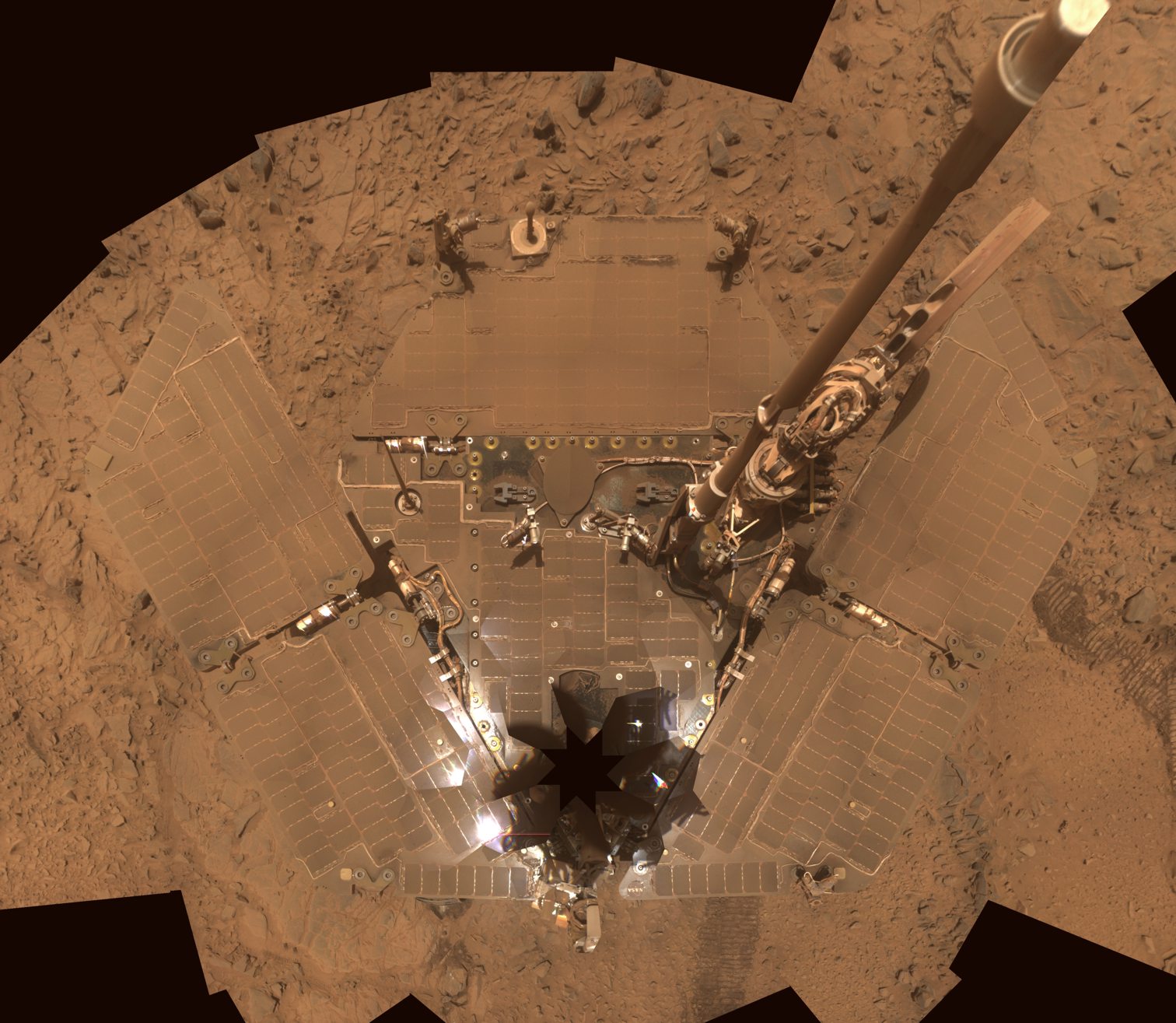 Das Bild zeigt, dass eine "Tarnabdeckung" des Solarpaneele stattgefunden hat, die bei einem Blick von oben den Rover nahezu vollkommen unsichtbar im Vergleich zu seiner Umgebung werden lässt. Im sauberen Zustand wären die Solarpaneele tiefschwarz und würden das Sonnenlicht optimal absorbieren. Ein ernstes Problem für die Energieversorgung !