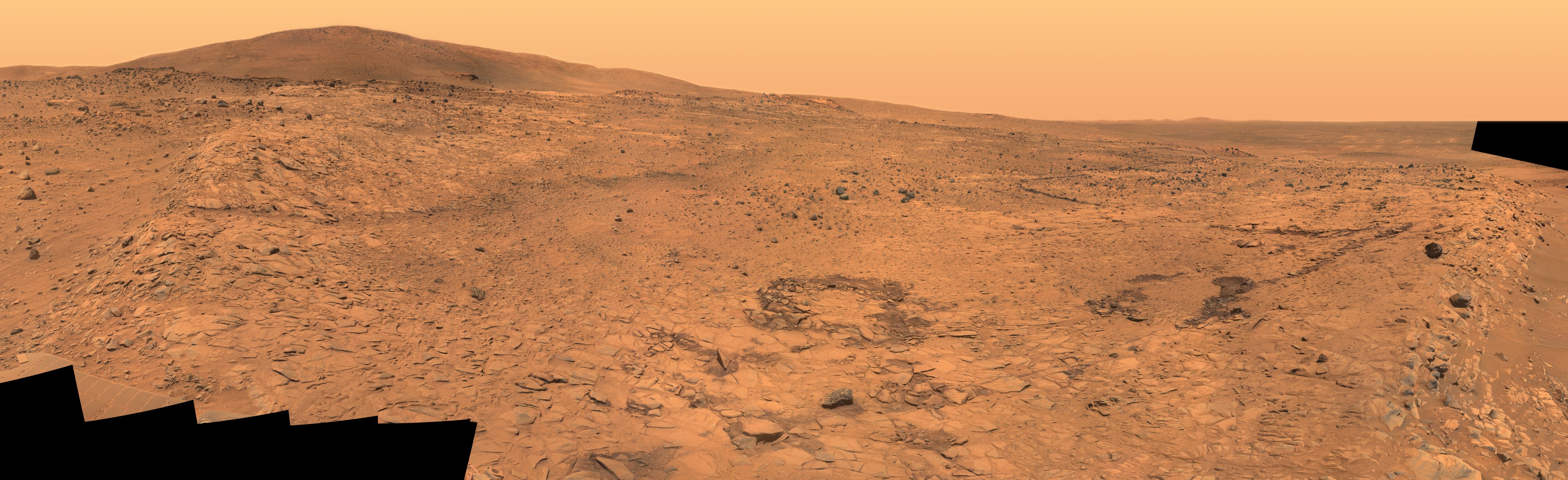 ... und der direkte Blick nach Süden auf den 2 km hohen Kraterrand des Gusev Kraters in etwa 80 km Entfernung ist hier: