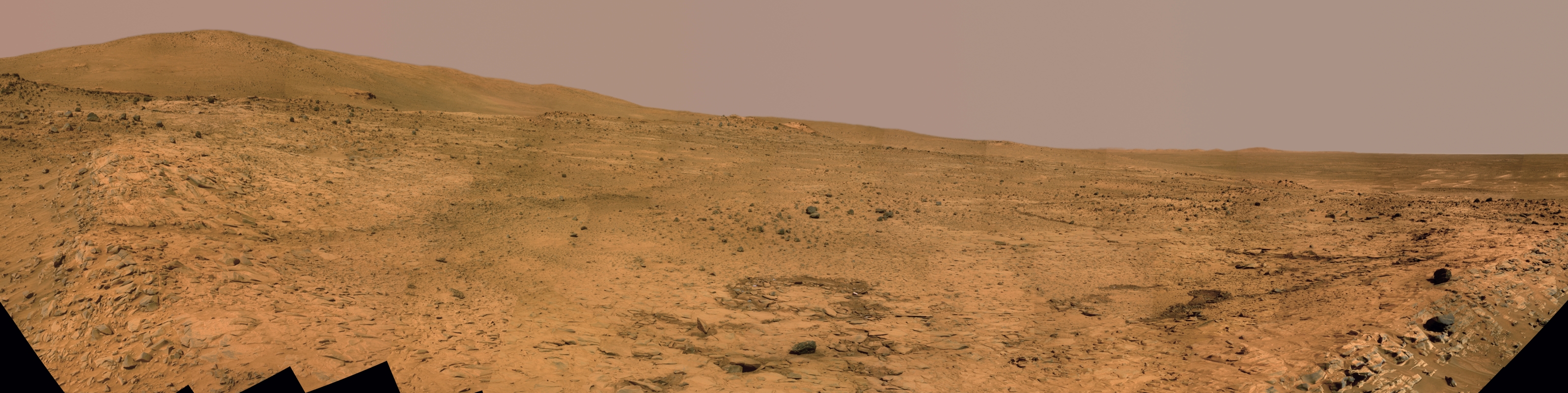 Ende August 2008 veröffentlichte die NASA den ersten Teil des sog. "Bonestell-Panoramas", das Spirit während seiner Winterpause mit allen seinen optischen Filtern hochaufgelöst nach und nach in einzelnen Schritten trotz aller Energieprobleme fotografierte. Hier der Teil in südlicher Richtung quer über die Home Plate hinweg mit dem McCool Hill hinten im Bild: