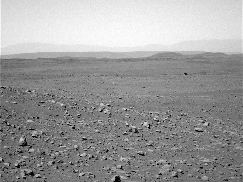 Das nächste Bild zeigt die Lage der Columbia-Berge im Kontext der weiteren Umgebung um den Landeort des Raumschiffes herum, der etwa 2km westlich des Zentrum der Columbia Berge beim Krater Bonneville liegt, siehe auch hier. Dieses Bild ist genauso wie das nächste vom Orbiter Mars Odyssey aus aufgenommen, der zusammen mit dem älteren Orbiter Mars Global Surveyor als Funkrelaisstationen des Rovers mit der Erde diente.