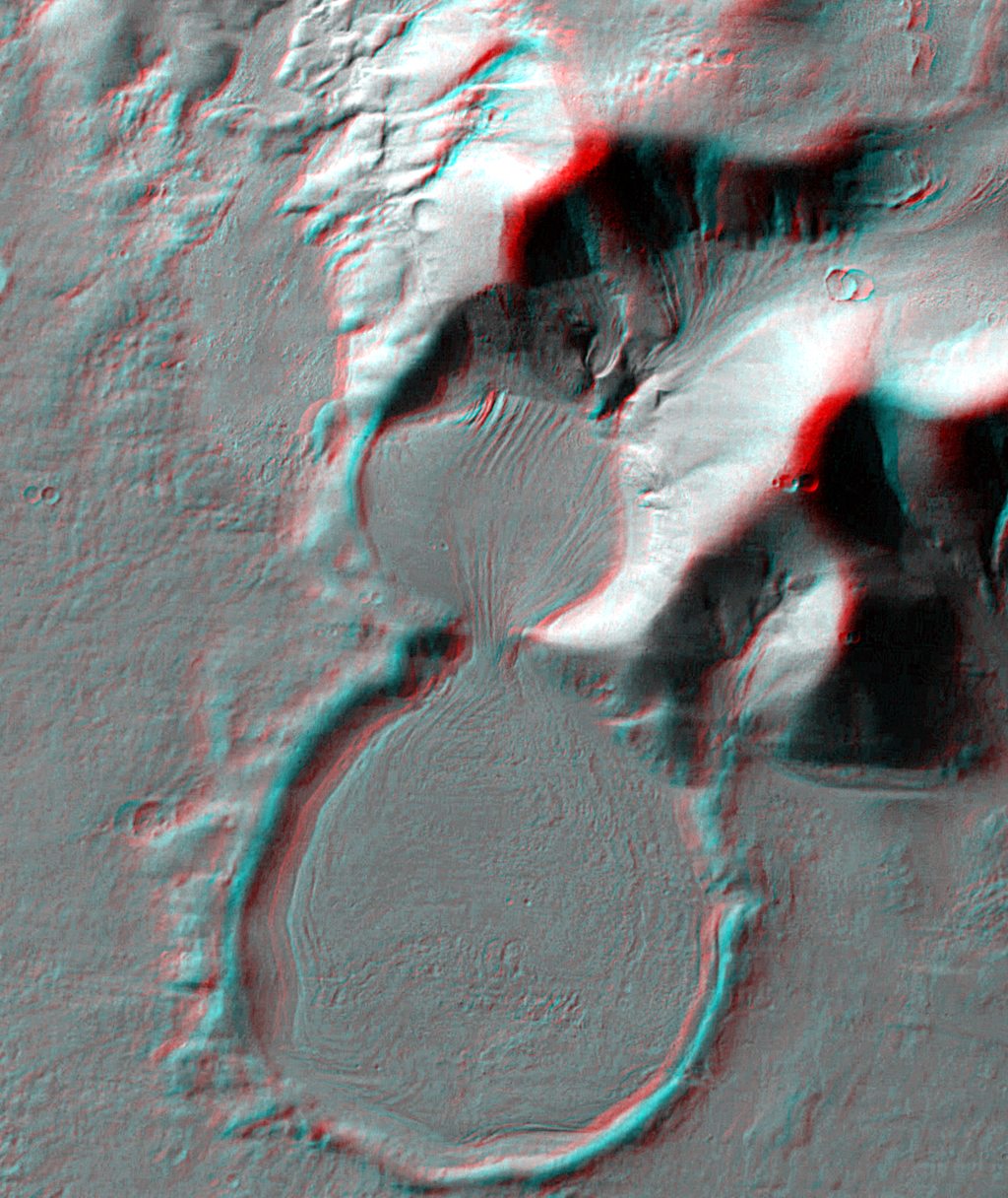 | Ein ähnliches Bild: in Promethei Terra, am östlichen Rand der Hellas Tiefebene bei 38º südl. Breite und 104º östl. Länge, liegt der "Uhrglasskrater". Aus den mehrere tausend Meter hohen Bergen im oberen Bereich des Bildes ist Wassereis in einen 9 km breiten Einschlagkrater geströmt und hat ihn fast bis zum Rand aufgefüllt. Dabei ist ein Teil des Eises in einen 500 m tiefer gelegenen, 17 km durchmessenden weiteren Krater geflossen. Die Höhenunterschiede sind besonders eindrucksvoll mit einer rot/blau-Brille (blau rechts) zu sehen. |
