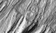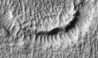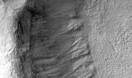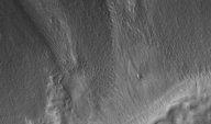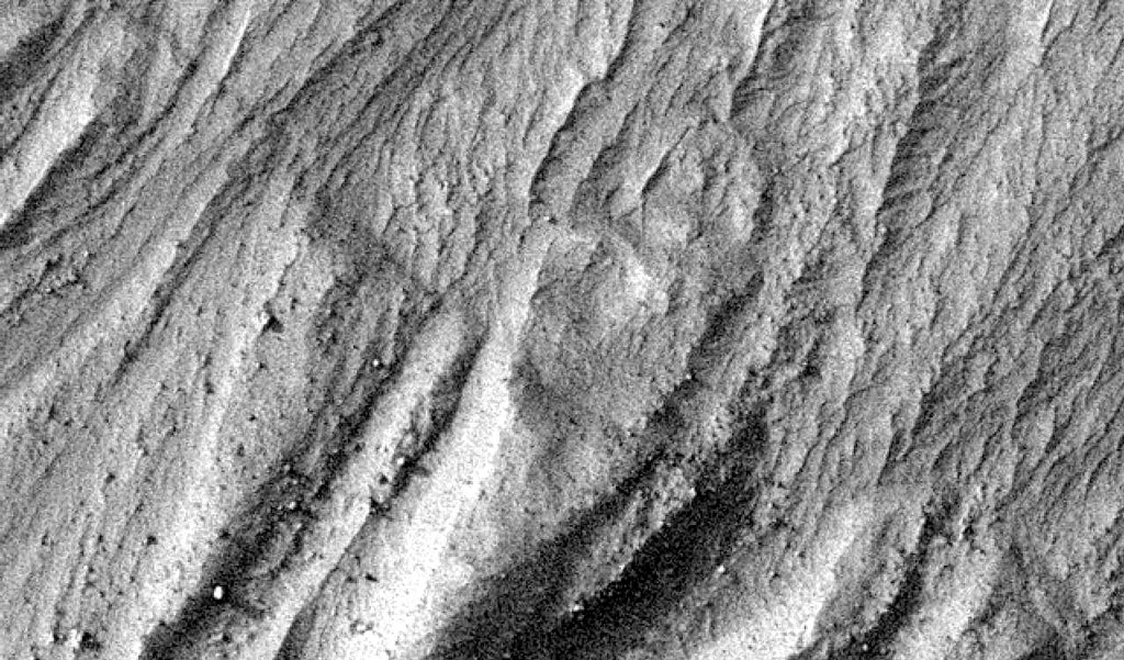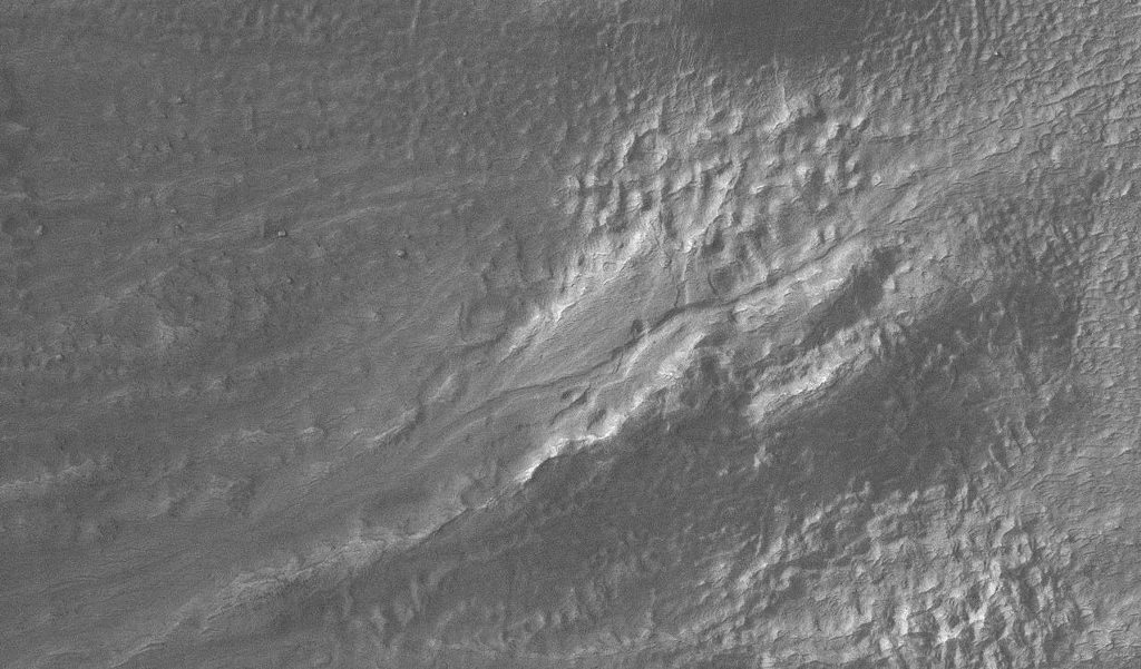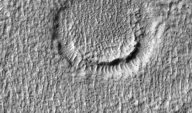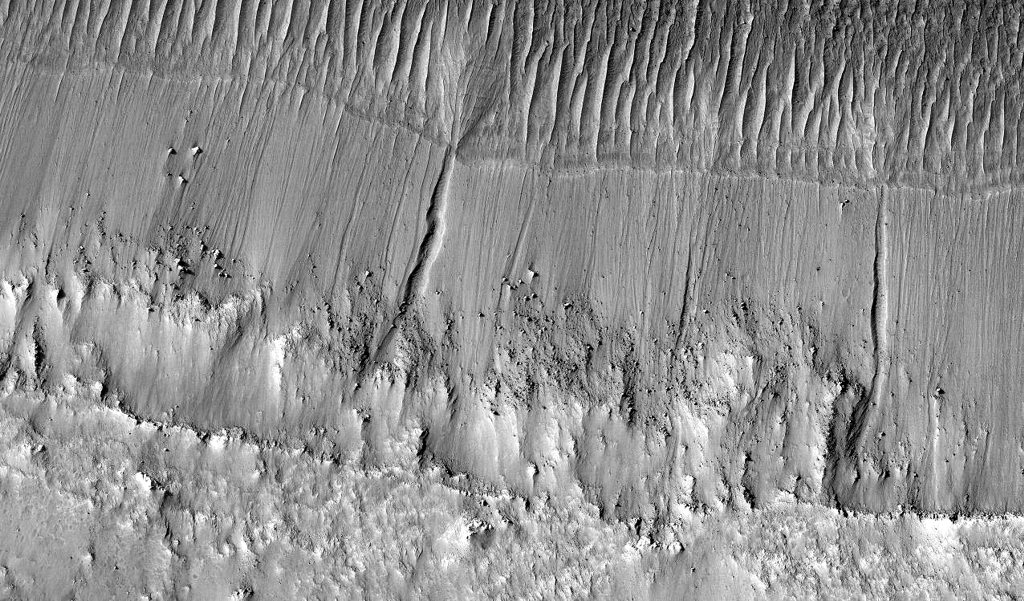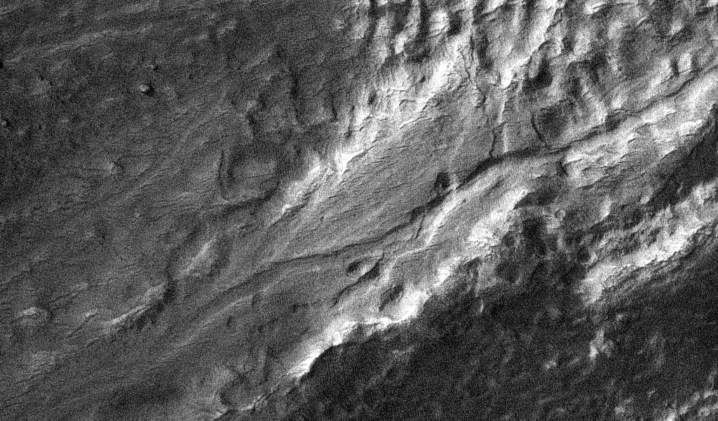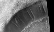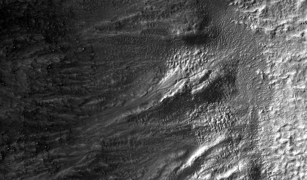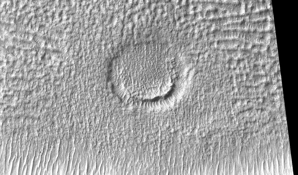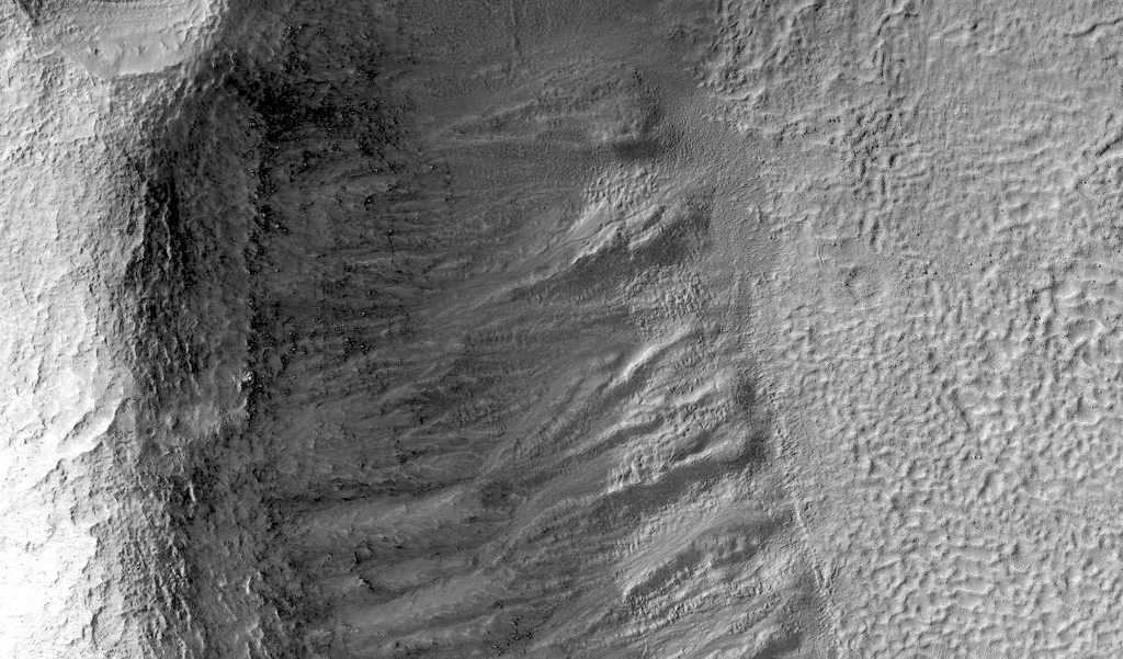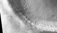 Der etwa 10 km durchmessende Krater im Gebiet "Terra Cimmeria" zeigt wie viele andere Krater in dieser Gegend eine besondere Struktur im Kraterboden, denn der Krater ist aufgefüllt mit einer viskosen Mischung aus Felsen, Sand und Eis. Diese Füllung geschah erst nach der Kraterentstehung, vermutlich durch Verflüssigungen, die durch die Energie des Kratereinschlages entstanden sind. Diese Interpretation setzt eine wässrige Eisschicht unter der Oberfläche an dieser Stelle voraus. Die folgenden Bilder zeigen Ausschnitte der felsigen Kraterwand, die mit einem starken Gefälle in die viskose Schicht des Kraterbodens übergeht. Die Grenzschicht zwischen der felsigen Struktur des Kraterrandes und der Bodenfüllung lässt sich über mehrer Kilometer hinweg entlang des Kraterbodens als eine zusätzliche Stufe in der Kraterwand verfolgen.