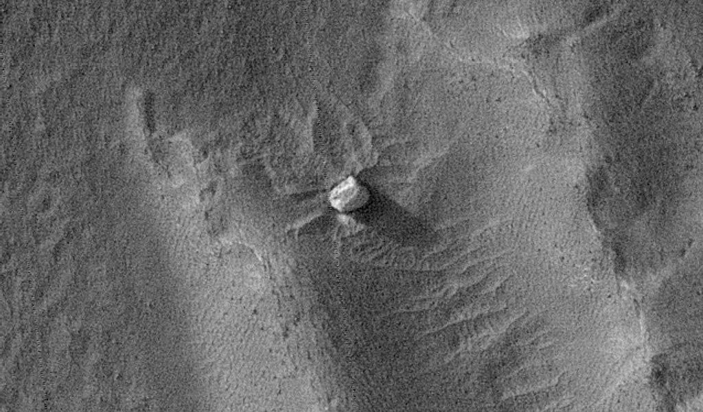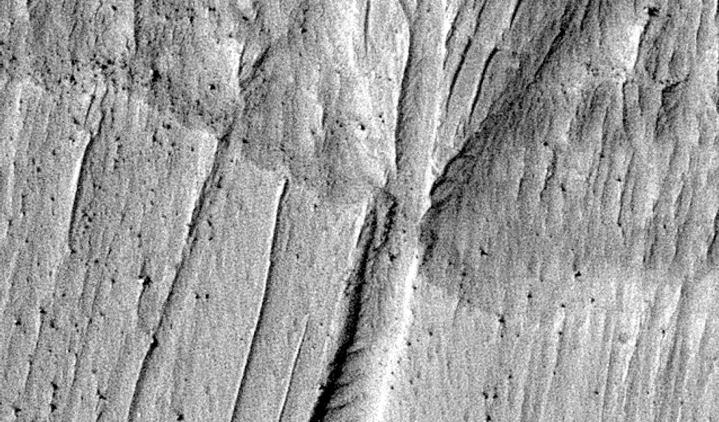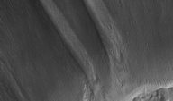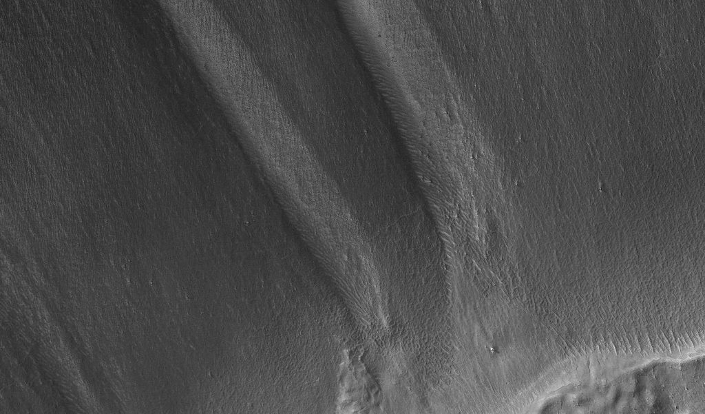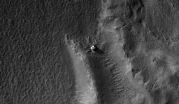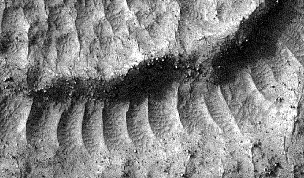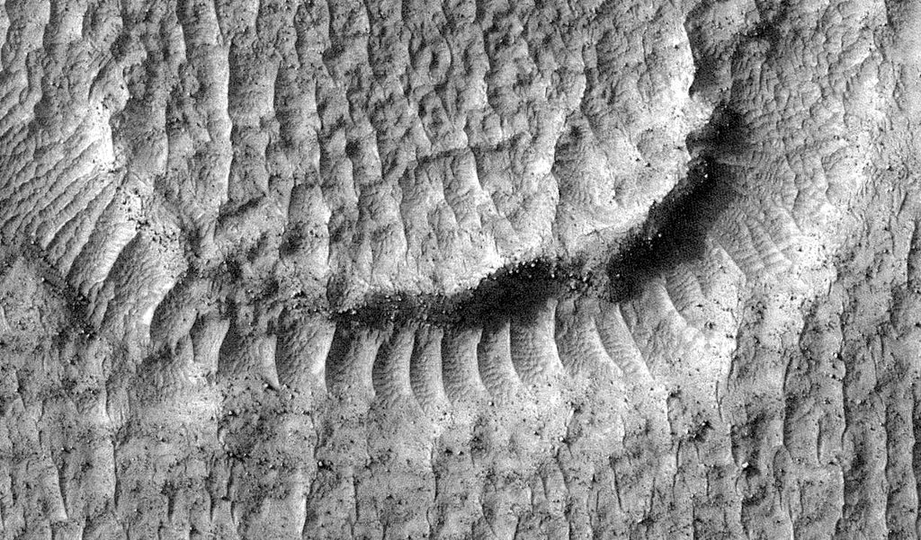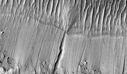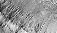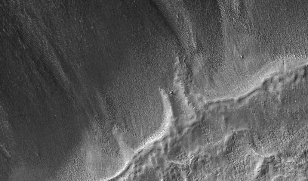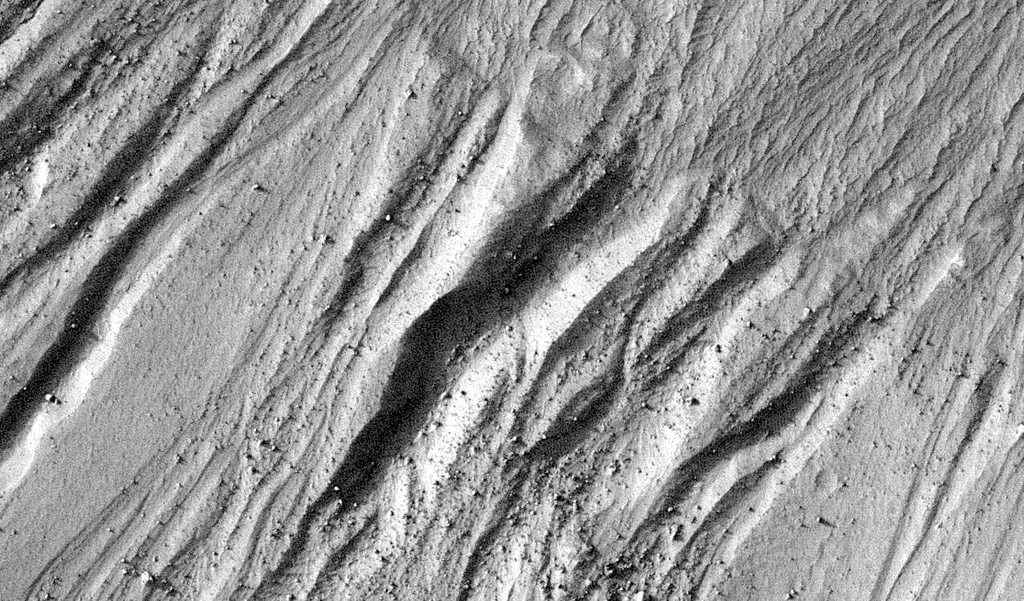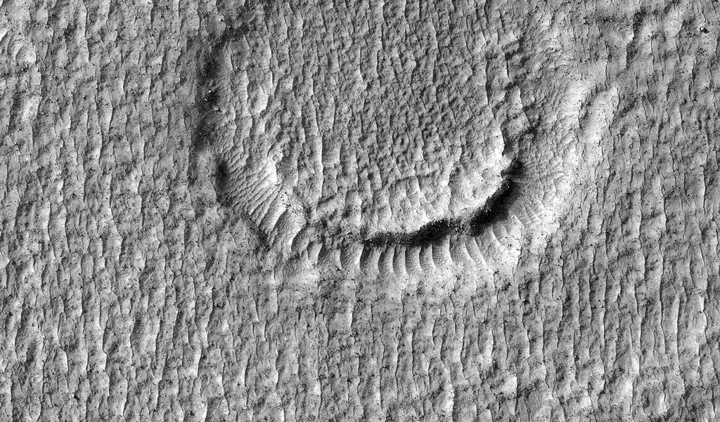 Der etwa 10 km durchmessende Krater im Gebiet "Terra Cimmeria" zeigt wie viele andere Krater in dieser Gegend eine besondere Struktur im Kraterboden, denn der Krater ist aufgefüllt mit einer viskosen Mischung aus Felsen, Sand und Eis. Diese Füllung geschah erst nach der Kraterentstehung, vermutlich durch Verflüssigungen, die durch die Energie des Kratereinschlages entstanden sind. Diese Interpretation setzt eine wässrige Eisschicht unter der Oberfläche an dieser Stelle voraus. Die folgenden Bilder zeigen Ausschnitte der felsigen Kraterwand, die mit einem starken Gefälle in die viskose Schicht des Kraterbodens übergeht. Die Grenzschicht zwischen der felsigen Struktur des Kraterrandes und der Bodenfüllung lässt sich über mehrer Kilometer hinweg entlang des Kraterbodens als eine zusätzliche Stufe in der Kraterwand verfolgen.