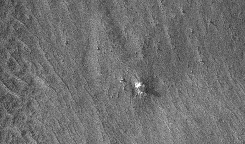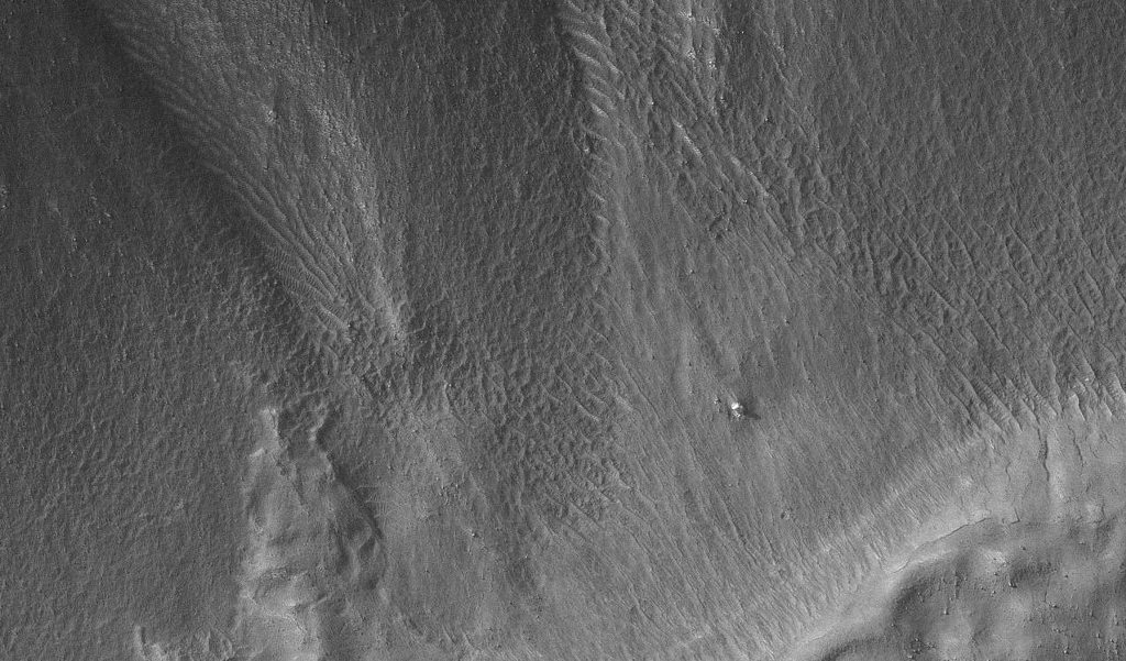 Übersichtsbild des Kraters in Terra Cimmeria. Das Zentrum dieses Bildes ist zentriert bei -42.7° westlicher Höhe und 158.5° östliche Länge, aufgenommen aus einer Höhe von 251.6 km um 15:47 Uhr lokaler Marszeit am Aufnahmeort. Die höchste Auflösung ist 25 cm pro Pixel. Die Sonne bescheint die Szenerie von links aus Westen mit einer Höhe von etwa 74° über dem Horizont.