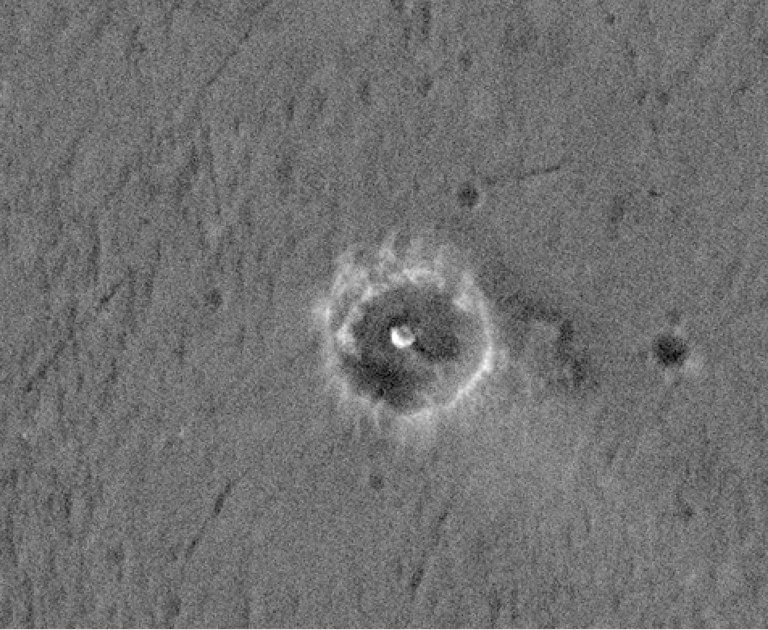 | Landeplatz des Raumschiffes im kleinen Krater "Eagle". Man sieht den zurückgelassenen Landerteil. Siehe auch hier Bilder aus früheren Veröffentlichungen. Man kann auch deutlich das intensiv von Opportunity untersuchte Felsenband im nordwestlichen Bereich des Kraters Eagle erkennen. |
