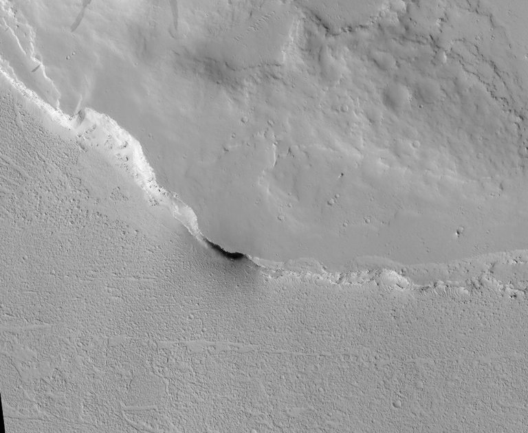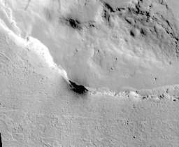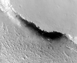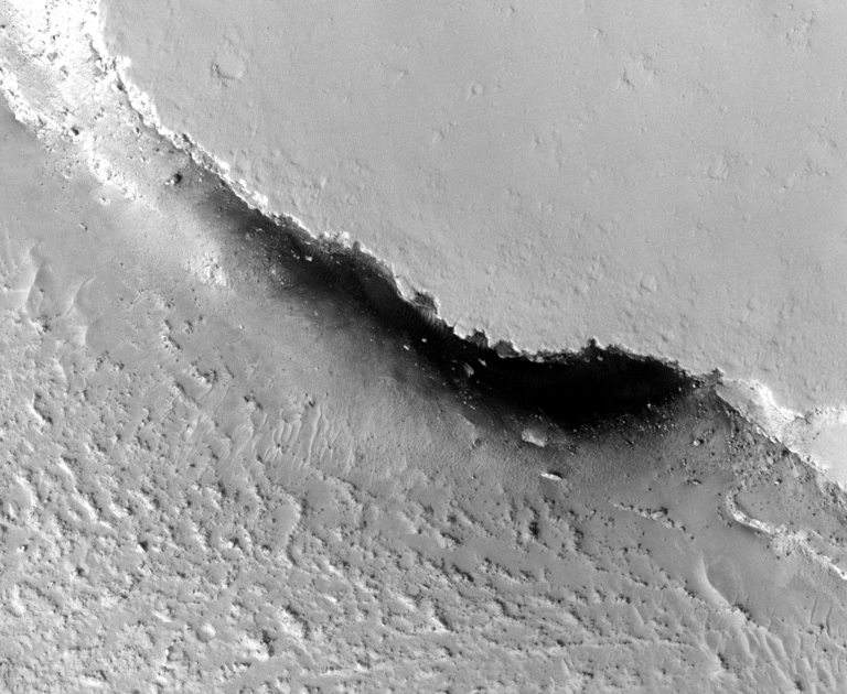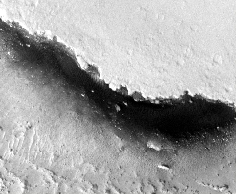 Interessant ist der Berg wegen seiner Streifen, die darauf hindeuten, dass hier Material die Hänge hinabgerutscht ist. Ein weiteres, sehr interessantes Detail ist am südwestlichen Rand dieses Berges zu sehen: der Zugang zu einem Felsüberhang oder zu einer Höhle ! Es gibt bisher nur wenige Indizien von unter der Marsoberfläche liegenden Höhlen (siehe z.B. hier die Höhle im Arsia Mons-Gebiet), dieser Berg ist eine davon. Die Zufahrt wäre sogar theoretisch mit Fahrzeugen zu befahren, was die Sache besonders fantastisch macht.