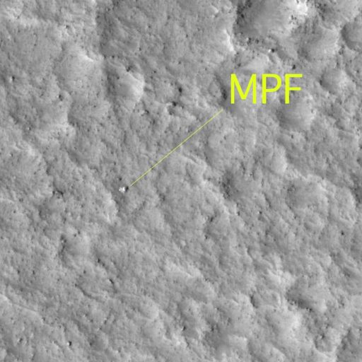 Anfang des Jahres 2007 fotografierte MRO hochaufgelöst den Landeplatz des Pathfinder-Raumschiffes, welches am 04. Juli 1997 im "Ares Vallis" am Ostausgang des grossen Valles Marineris Grabenbruches gelandet war. Pathfinder brachte seinerzeit zum ersten Mal einen kleinen Rover, den "Sojourner" auf den Mars, der autonom den Marsboden in der näheren Nachbarschaft des Landers untersuchen konnte. Das folgende Panoramabild zeigt den Blick am Landeort von Pathfinder: