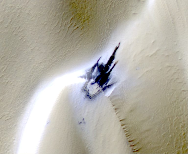 Am Nord- wie auch am Südpol wird durch das zu Frühlingsbeginn neu einfallende Sonnenlicht die Sublimationstemperatur des im Winter abgelagerten festen Kohlendioxids überschritten, sodass große Flächen der Polkappe in kurzer Zeit abgasen. Zu Beginn des Prozesses ist dies auf einige wenige punktuelle Bereiche begrenzt, die explosionartig vom festen in den gasförmigen Zustand übergehen und unter dem Eis liegende Staub- und Felsbrocken mitreißen. Diese verbreiten sich in der Umgebung der Ausbruchsstelle als dunkle Flecken neben der Ausbruchsstelle. Die folgenden Aufnahmen zeigt eine solche Stelle in zwei verschiedenen Auflösungen.