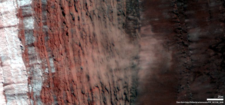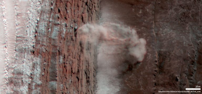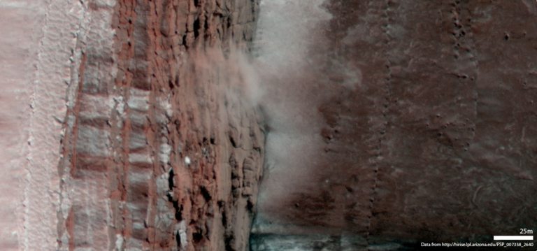 Die folgenden Bilder sind Ausschnitte aus der Originalveröffentlichung "Caught in Action: Avalanches on North Polar Scarps" des HiRise Operation Centers von Mars Reconaissance Orbiter, dem Betreiber der Hochauflösungskamera an Bord des Orbiters.
