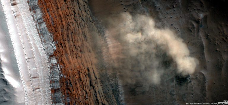 Die Abbruchkante der Eiskappe erstreckt sich im Bild unten von links nach rechts. Sie ist an dieser Stelle etwa 700 m dick und besteht zu Beginn des Frühlings im Wesentlichen aus weissem Trockeneis, gefrorenem Kohlendioxid. Die Hangneigung in diesem Bereich ist größer als 60°. Im oberen Bildberich liegt der 700m tiefer liegende Bereich, der wesentlich flacher mit einer Hangneigung von nur noch etwa 15-20° verläuft. Die Abbruchkante ist geschichtet und enthält neben dem Trockeneis bräunlich gefärbten Staub und Felsen sowie in geringeren Mengen eingebettetes Wassereis. Durch die Temperatureffekte des aufziehenden Frühlings bei Beginn der Sonneneinstrahlung nach einem langen Winter lösen sich hier gerade offenbar Teile der Abbruchkante ab und stürzen unter Aufwirbeln von großen Staubwolken in die Tiefe (rechts von der Bildmitte). Links von der Bildmitte ist eine kleinere Lawine zu erkennen. Die größere Staubwolke im rechten Bereich ist etwa 300 m groß. Der 700 m tiefer liegende dunklere Bereich am oberen Bildrand besteht aus einem Gemisch von Staub, Felsbrocken und Wassereis und taut viel später bei höheren Temperaturen auf als die weisse Trockeneiskappe.