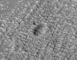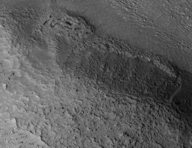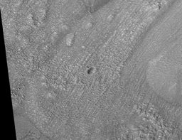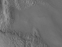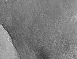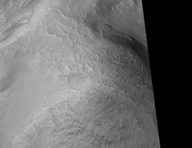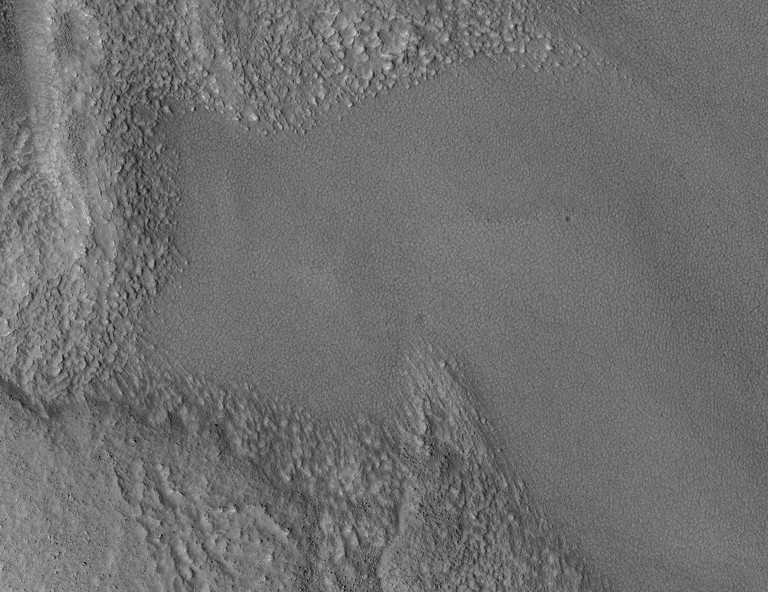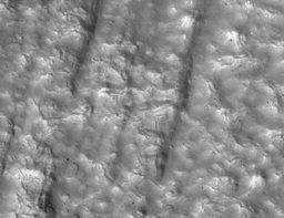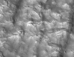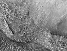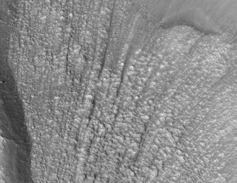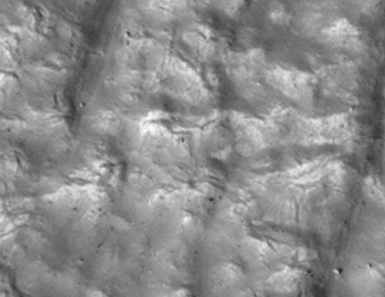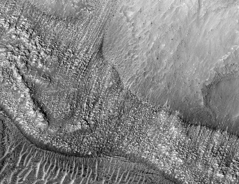 Die folgenden Bilder zeigen Ausschnitte des zentralen Kegelberges im Moreux-Krater, etwa 42° nördlich des Äquators. Die Topographie dieses Kraterkegels zeigt eine gletscherartige Struktur, die sich durch Fliessvorgänge die Bergabhänge hinab auszeichnet. So wie es aussieht, sind hier viskose Mischungen aus Gestein und Felsen die Bergabhänge hinabgeflossen. Auffällig ist, das in dieser Gegend keinerlei Krater sichtbar sind, was darauf hindeutet, das diese Strukturen jüngeren Datums sind.