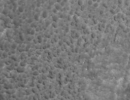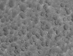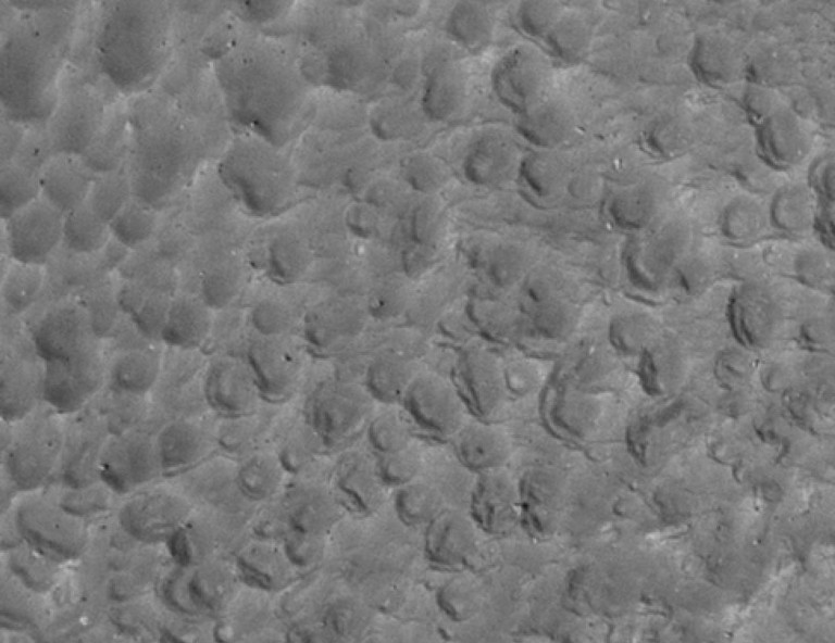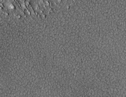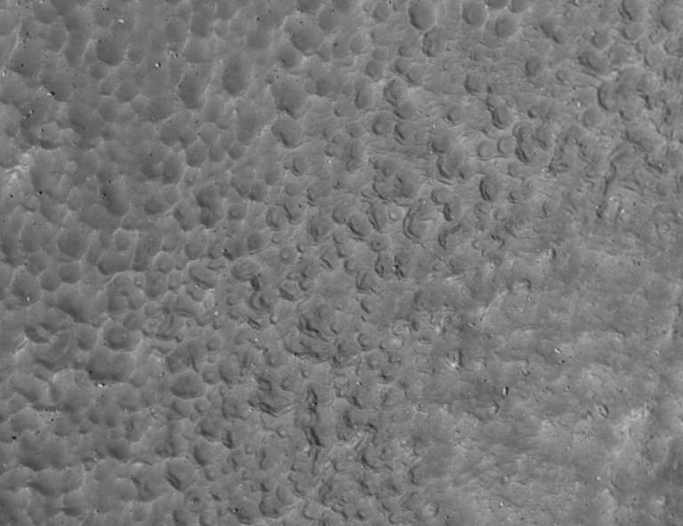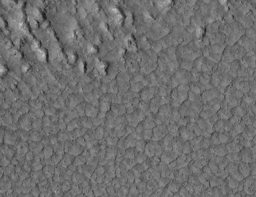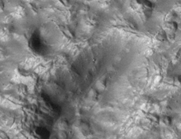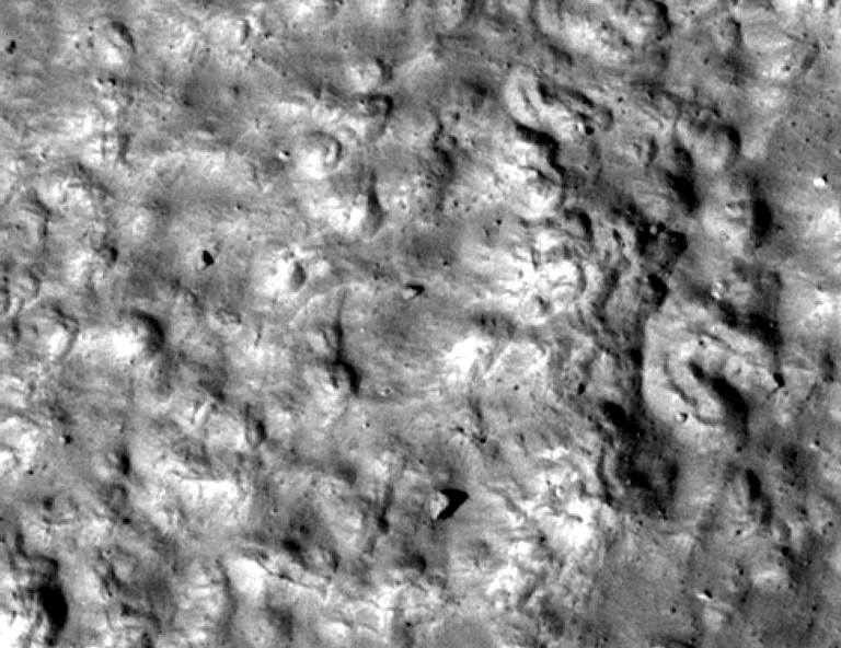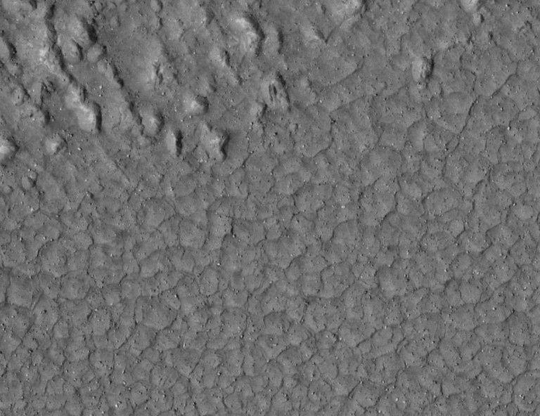 | Ausschnitt etwas oberhalb der Mitte rechts. Das Gelände ist hier in kleinere, polygonale Platten zerbrochen, die durch Temperatureffekte entstanden sind. Solche Platten weisen in der Regel auf gebundenes Eis dicht unter der Oberfläche hin. Klicken auf eines der Bilder liefert jeweils eine vergrößerte Ansicht, die Bildauflösung der gezeigten gleichen Gegend steigt von links nach rechts. |
