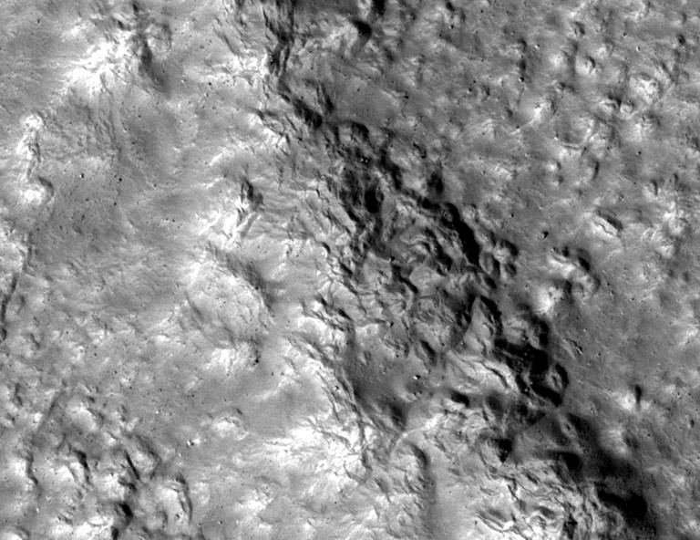 | Übersichtsbild des zentralen Kegelberges im Moreux Krater. Das Zentrum dieses Bildes ist zentriert bei 41.7° Höhe und 44.4° östliche Länge. Die Höhe des Bildes umfasst einen Bereich von 298 km Länge. Die höchste Auflösung ist 30 cm pro Pixel. Die Sonne bescheint die Szenerie von links mit einer Höhe von etwa 58° über dem Horizont.