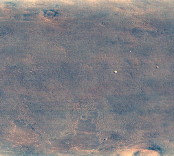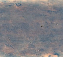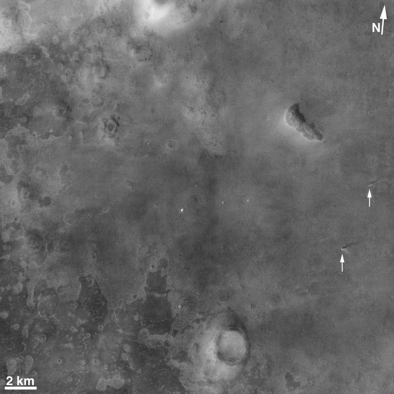 Das nächste Bild zeigt das Foto eines Bereiches nahe des Zentrums der Landellipse. Im rechten Teil des Bildes sind zwei riesige Staubteufel zu sehen, die sich mehr als 900 m (!) in die Höhe erstrecken.