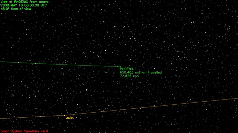 Das 4. Kurskorrekturmanöver TCM-4 des Mars-Landers "Phoenix" am frühen Morgen des 10. Mai fiel aus, da nach den letzen Flugbahnanalysen das Raumschiff exakt auf Zielkurs lag. Phoenix hatte sich zu der Zeit auf seinem Kurs vor den Planeten Mars gesetzt und flog etwas langsamer als der Planet auf seiner Bahn. Dadurch wurde Phoenix langsam vom Mars eingeholt. Durch einen solchen Kurs hielt man die Atmosphäreneintrittsgeschwindigkeit des Landers so klein wie möglich. Das nächste Bild zeigt die Situation am 10. Mai 2008 zur Zeit von TCM-4: