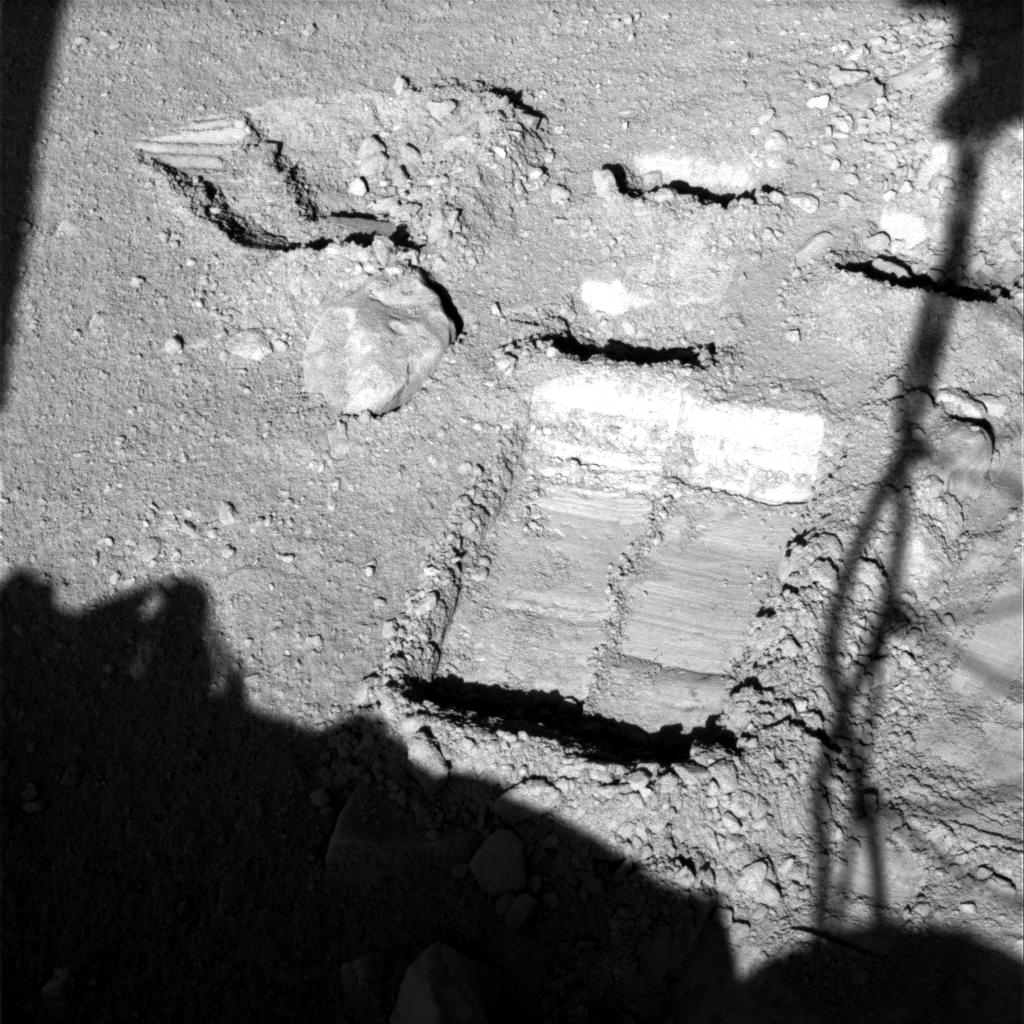 Die mögliche Eisbildung mit Voranschreiten der Jahreszeit, zunächst während der marsianischen Nacht, wurde ab Sol 80 mit in das Beobachtungsprogramm aufgenommen. Das folgende Foto zeit eine dazu ausgewählte Region in südöstlicher Richtung vom Lander, die immer wieder in der Folgezeit mit dieser Absicht fotografiert wurde. Sie ist besonders reich an Steinen, in deren Schatten Eis als erstes zu beobachten wäre. Hier ist allerdings an Sol 71 um 4:45 Uhr in der Frühe noch keinerlei Eisbildung zu beobachten: