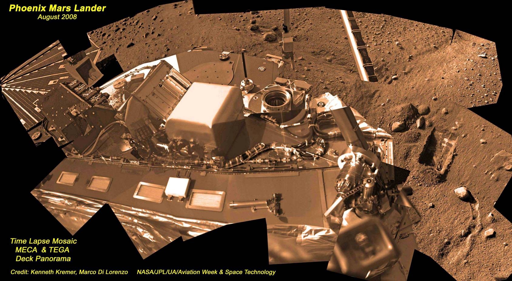 Einen schönen Blick über das Landerdeck zeigt das nächste Bild, das in der Ausgabe der "Aviation Week" vom 11. August 2008 auf den Seiten 6 und 30 im Phoenix-Report von Craig Covault mit dem Titel "Martian Chronicles Revisited" benutzt wurde. Es stammt von den in der Bildunterzeile genannten Autoren Kenneth Kremer und Marco Di Lorenzo.
