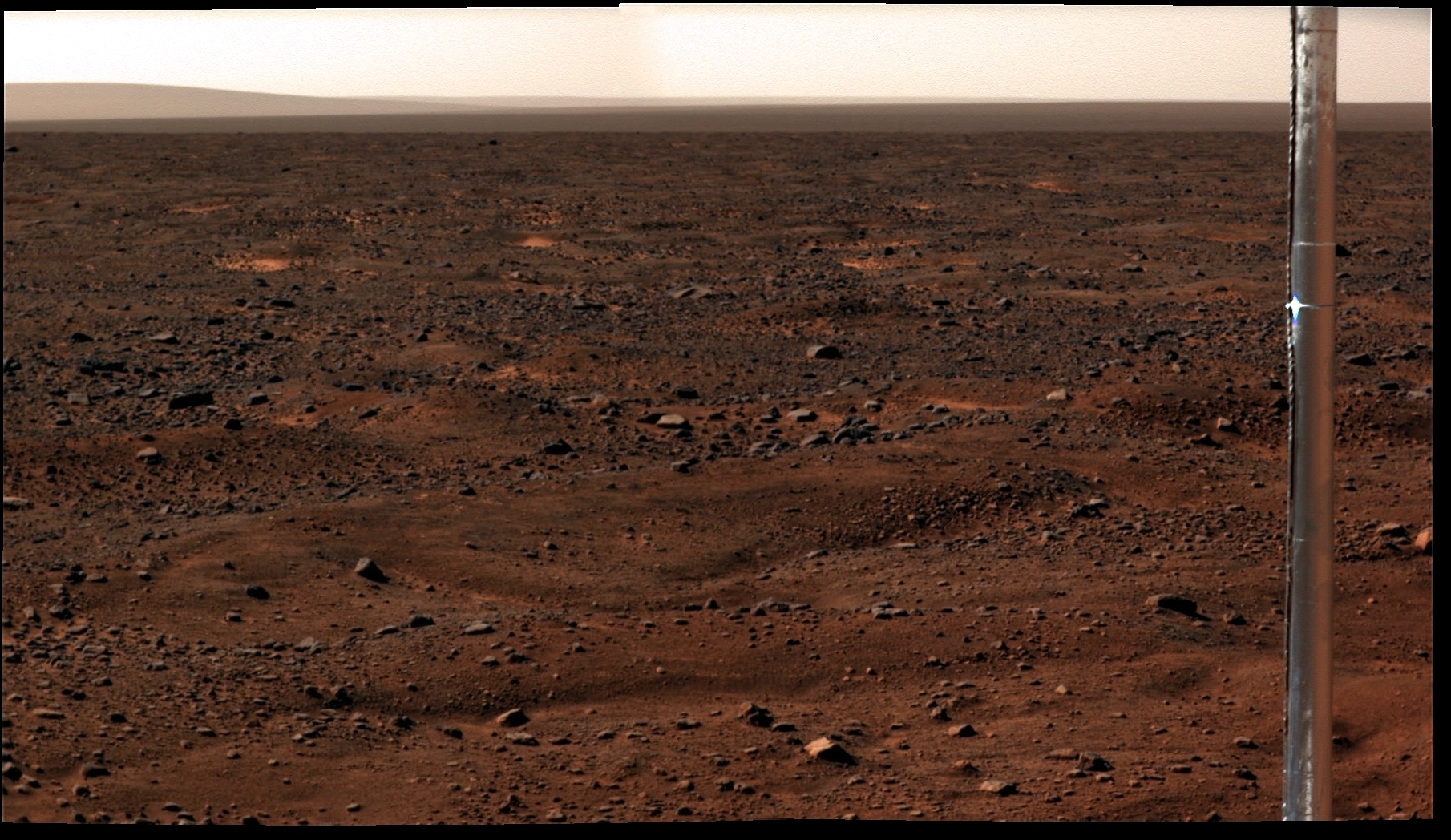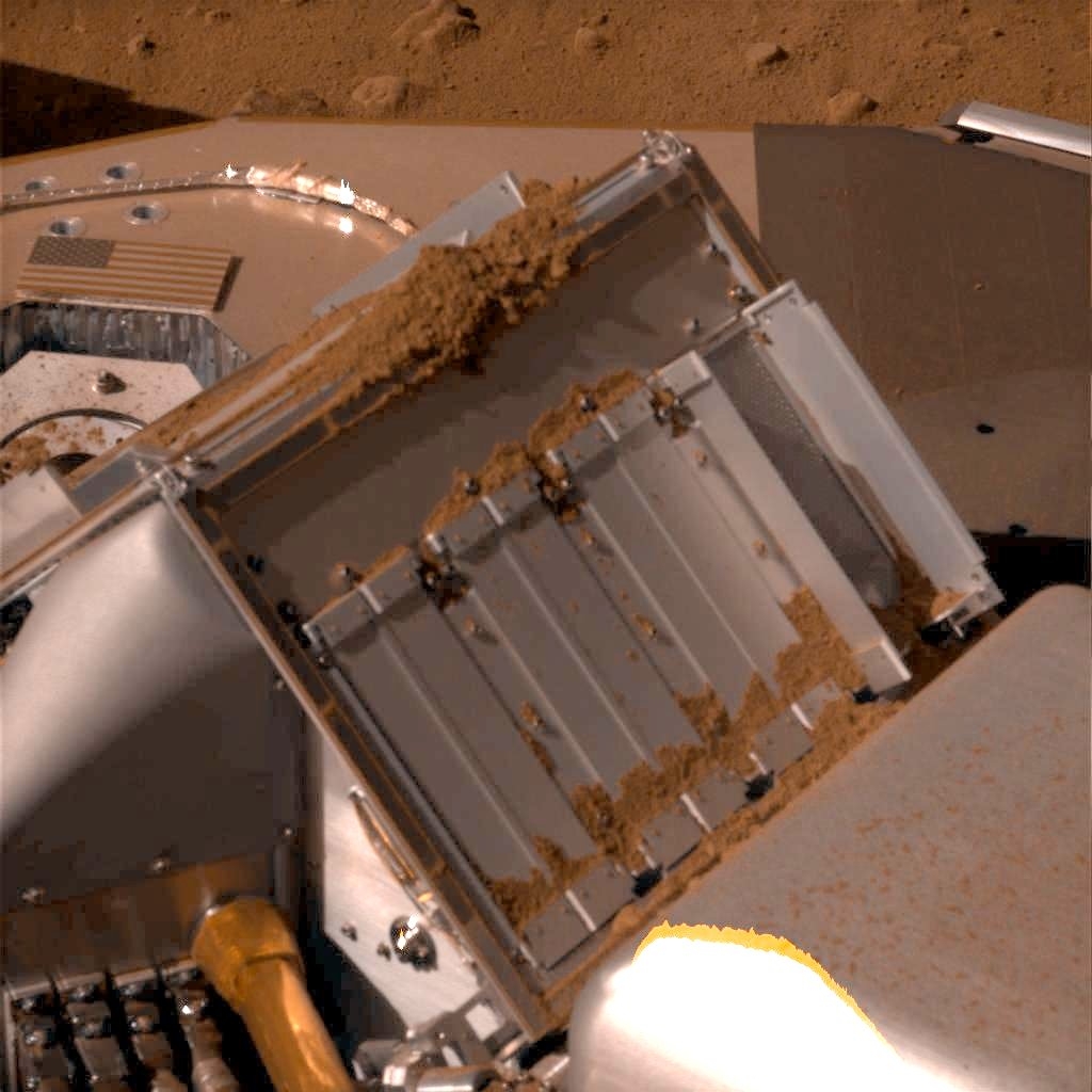 | Abb. 10: Der Windrichtungsmesser am oberen Ende des Instrumentenarms zeigt an Sol 78 bereits deutliche Ablagerungen von rotem Marsstaub. |
