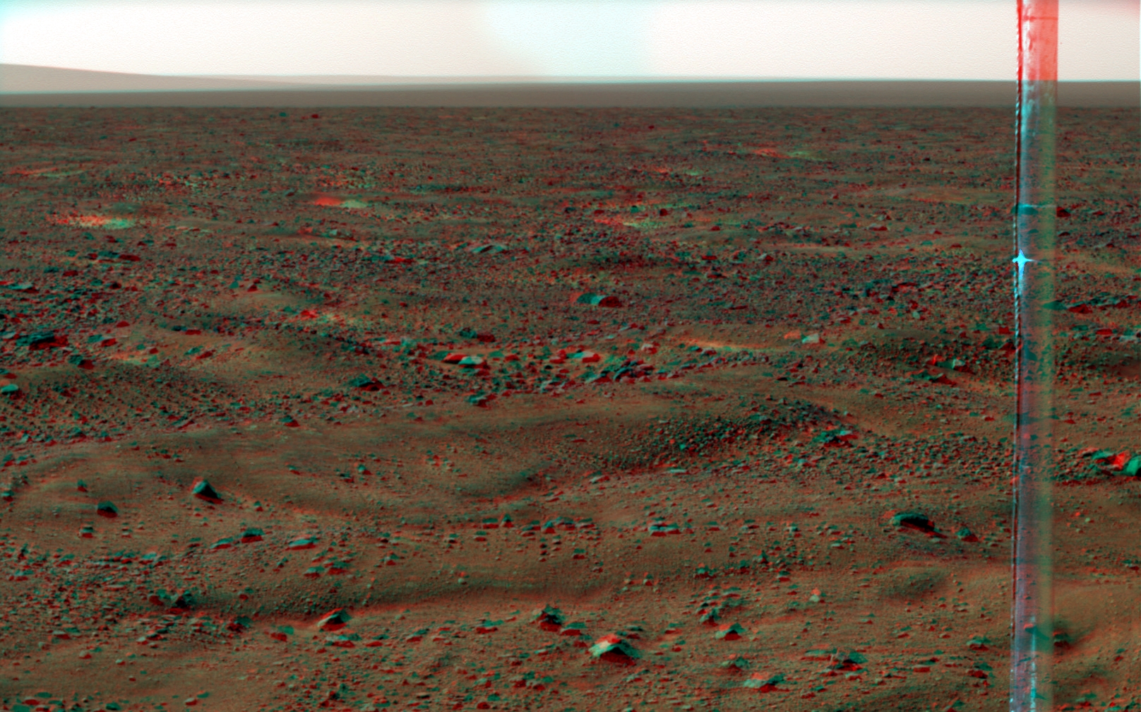 | Abb. 6b: Blick von Phoenix nach Norden auf das Randgebirge des Kraters Heimdall in 3D. Mit einer rotgrün-Brille zeigt sich besonders deutlich, wie wellig die Marsoberfläche an dieser Stelle eigentlich ist. |