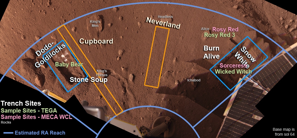 | Abb. 1: Heftige Grabungsaktivitäten Mitte August 2008 führten zu einer Anzahl von neuen Gräben. Die Abbildung zeigt den Grabungsbereich von Phoenix mit den aktuellen Benennungen bis Sol 68. |