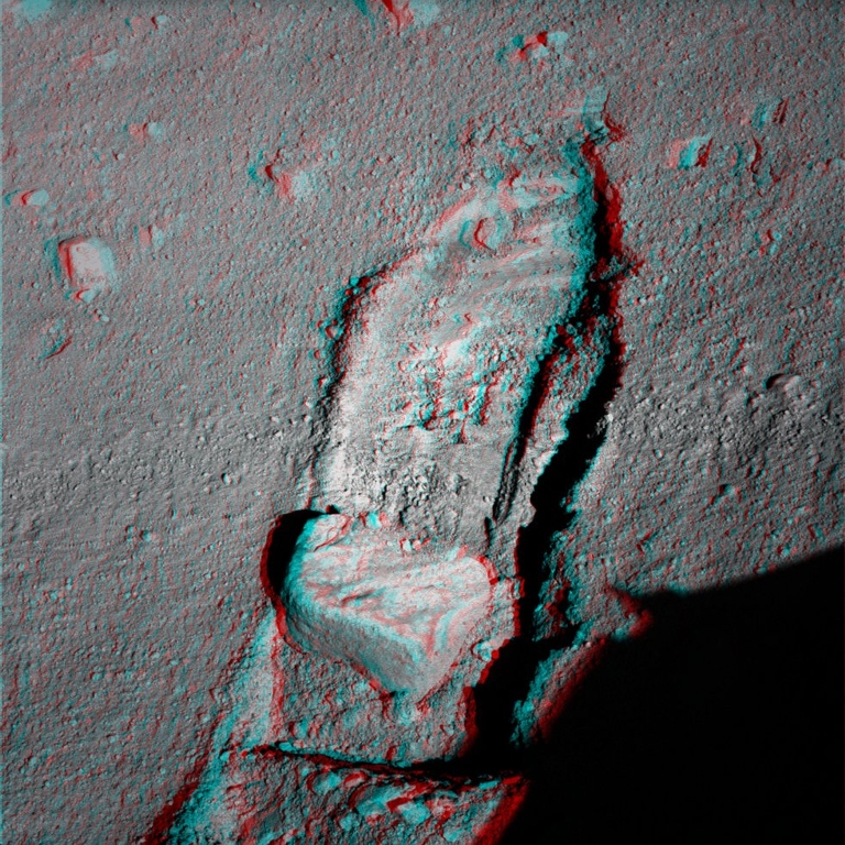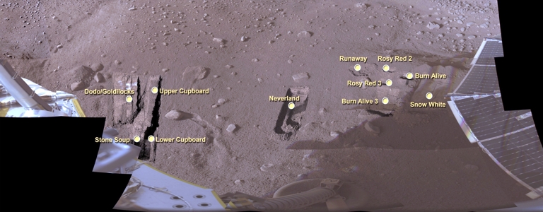 Abb. 2: Die Region "Stone Soup", aus der in 18 cm Tiefe die Bodenprobe für den TEGA Ofen Nr. 2 entnommen wurde. Oben links der alte Graben "Dodo Goldilocks" mit dem freiliegenden Eis an seinem oberen Ende. |