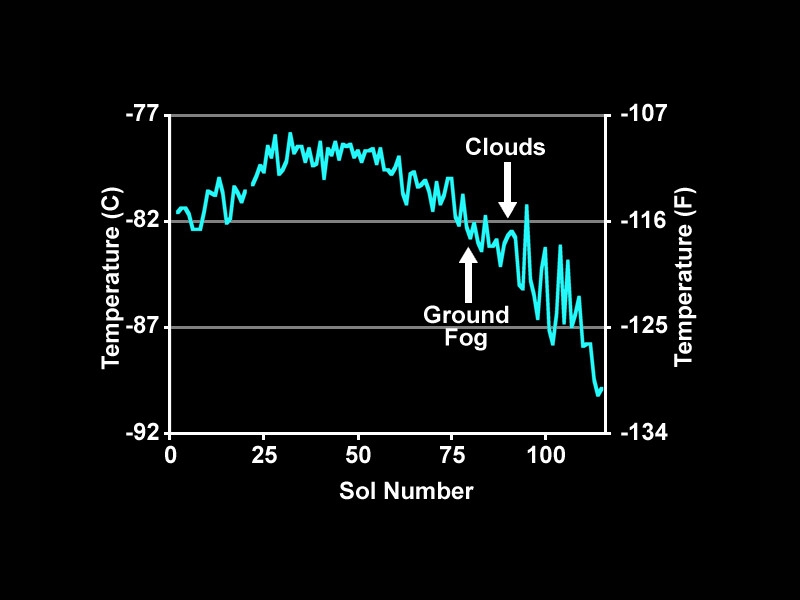 Abb. 4b: Die gemessenen Temperaturminima während der Nacht am Standort von Phoenix während der ersten 120 Sols der Mission. Die höchsten Nachttemperaturen mit -80°C herrschten zur Mittsommernachtszeit um Sol 30 herum. Ab Sol 120, bei einer nächtlichen Dunkelzeit von 4 Stunden, sank die Nachttemperatur bereits auf -90°C. Ab etwa -120°C fror Kohlendioxid als Trockeneis aus der Atmosphäre aus und begrub Phoenix in einem alles erstickenden Eispanzer. |